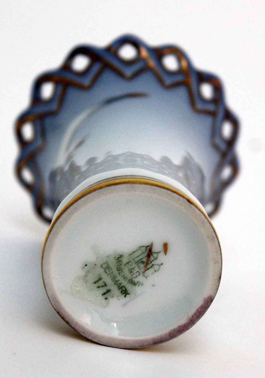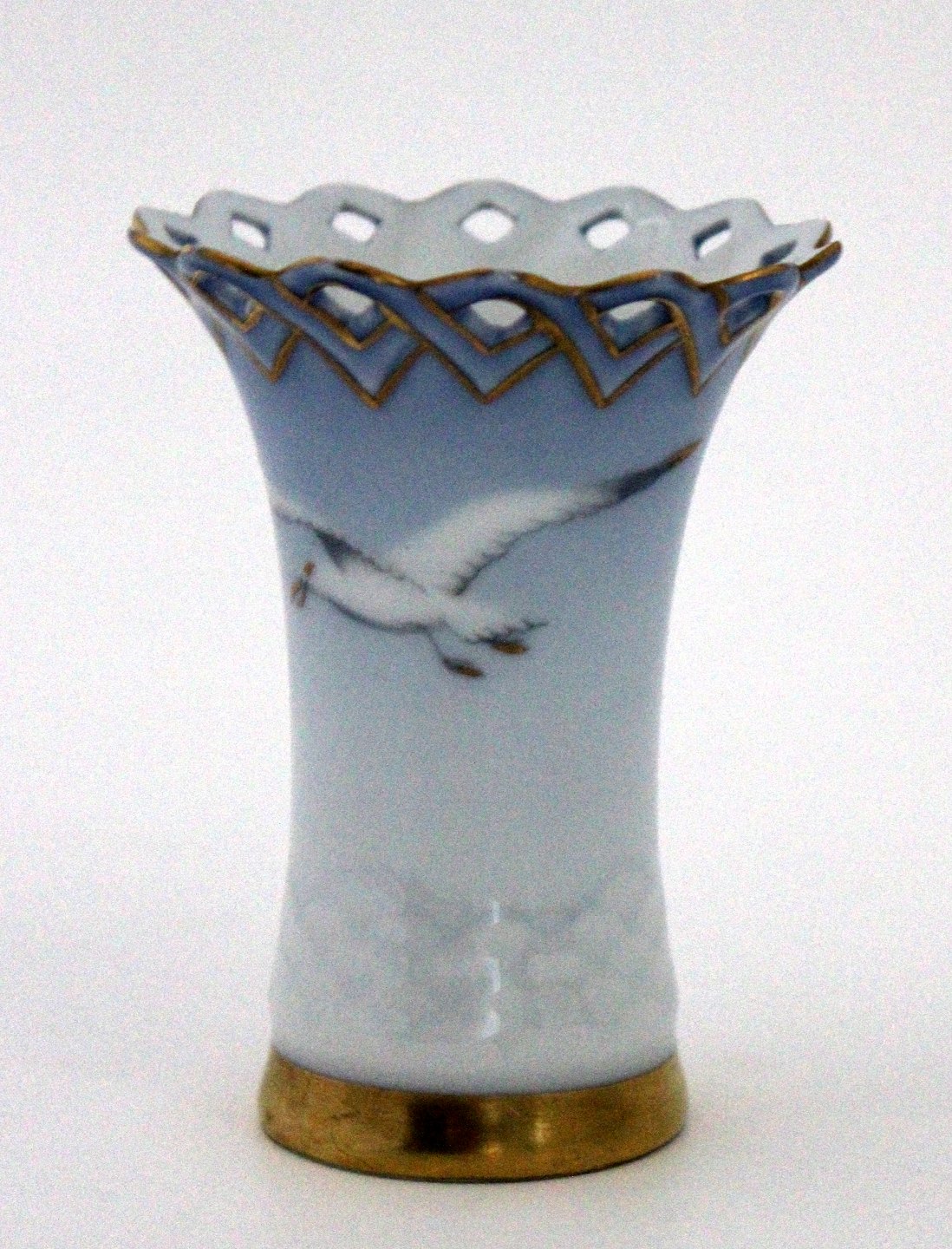 Text available in Danish: Bing & Grøndahl, Måge med guld, Kuvertvase med hulkant. Nr. 171. Højde 7,5 cm. Øverste diameter 6 cm. I. sortering. Pris: 175 kr. stk. Lager: 1