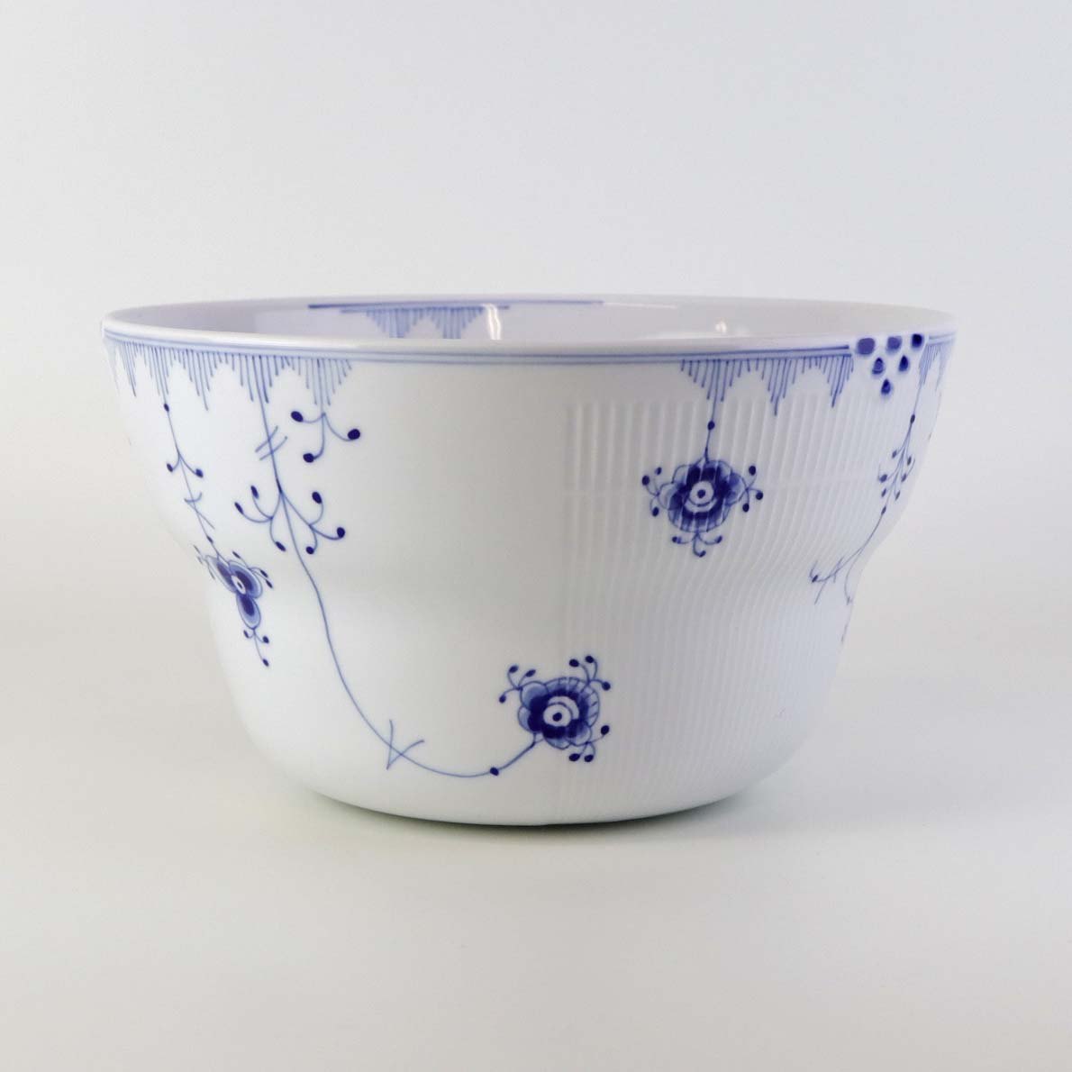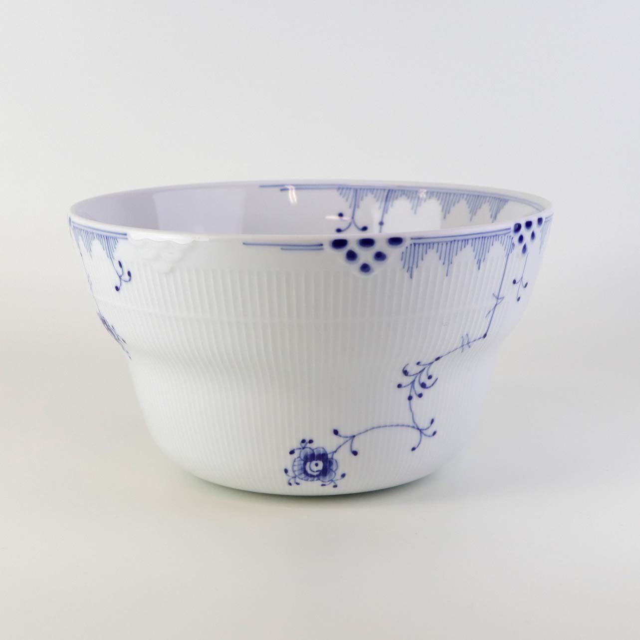 Service i glat porcelæn med let riflet kant og blå dekoration
