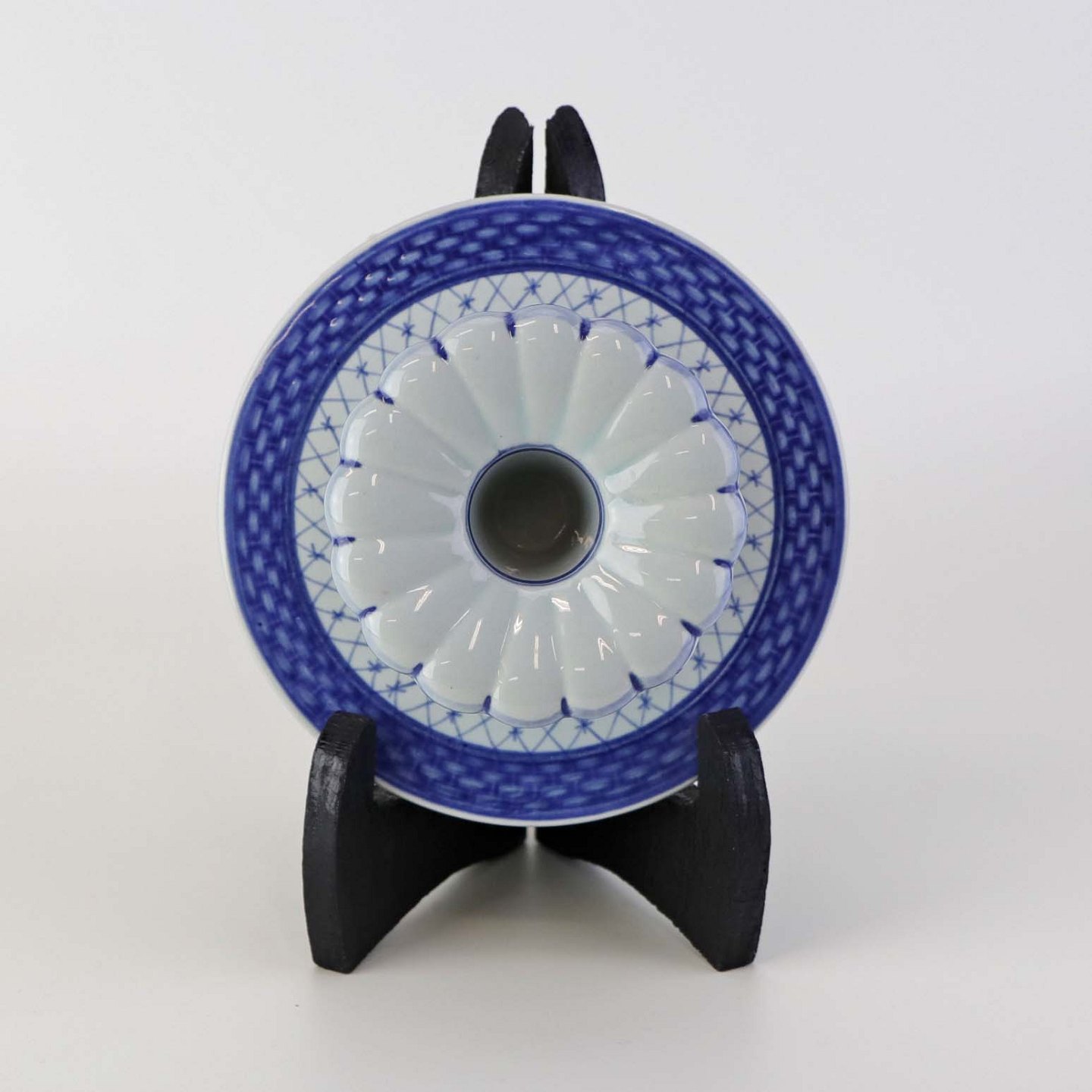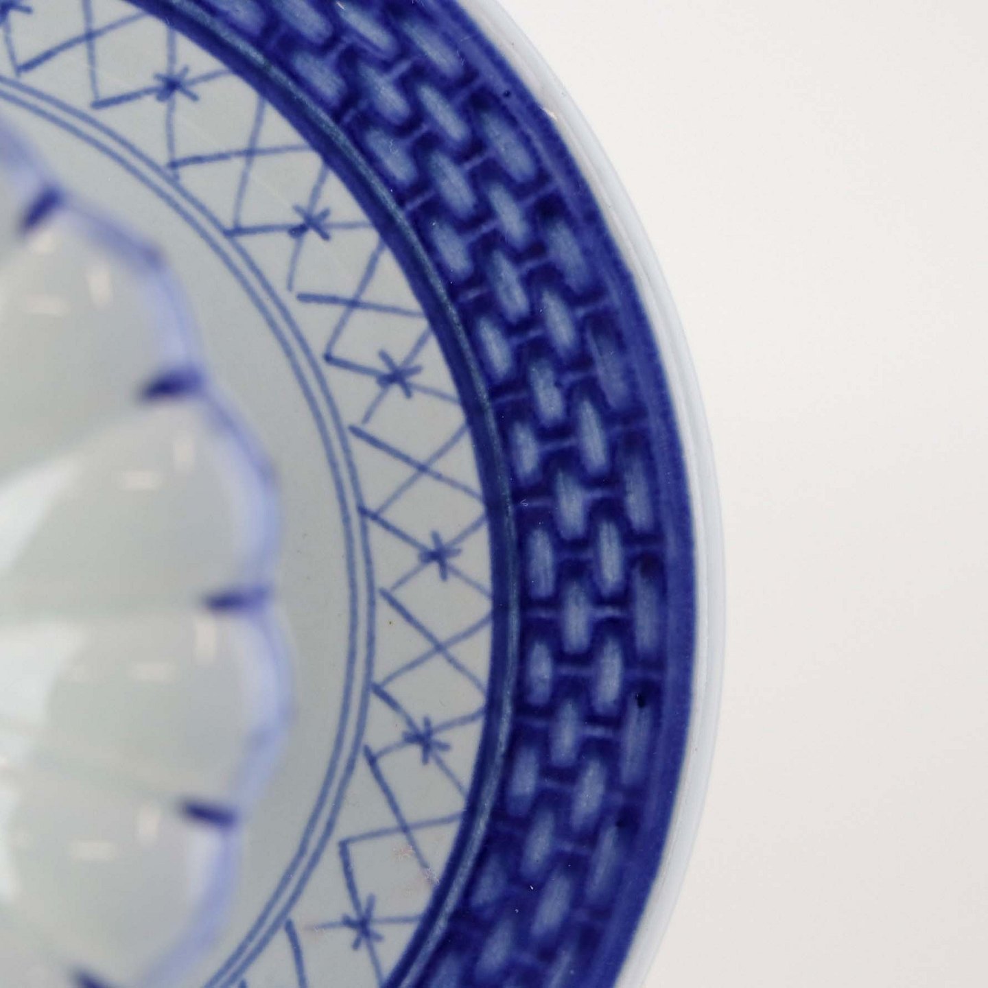 Glat lyst fajance med blå dekoration af blomster og blå bort.