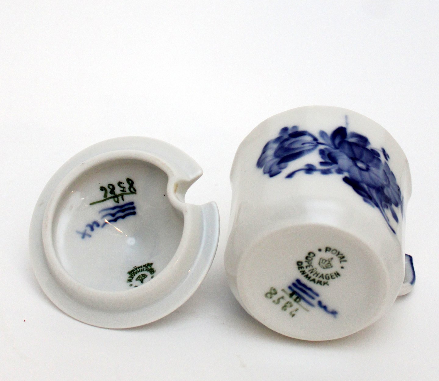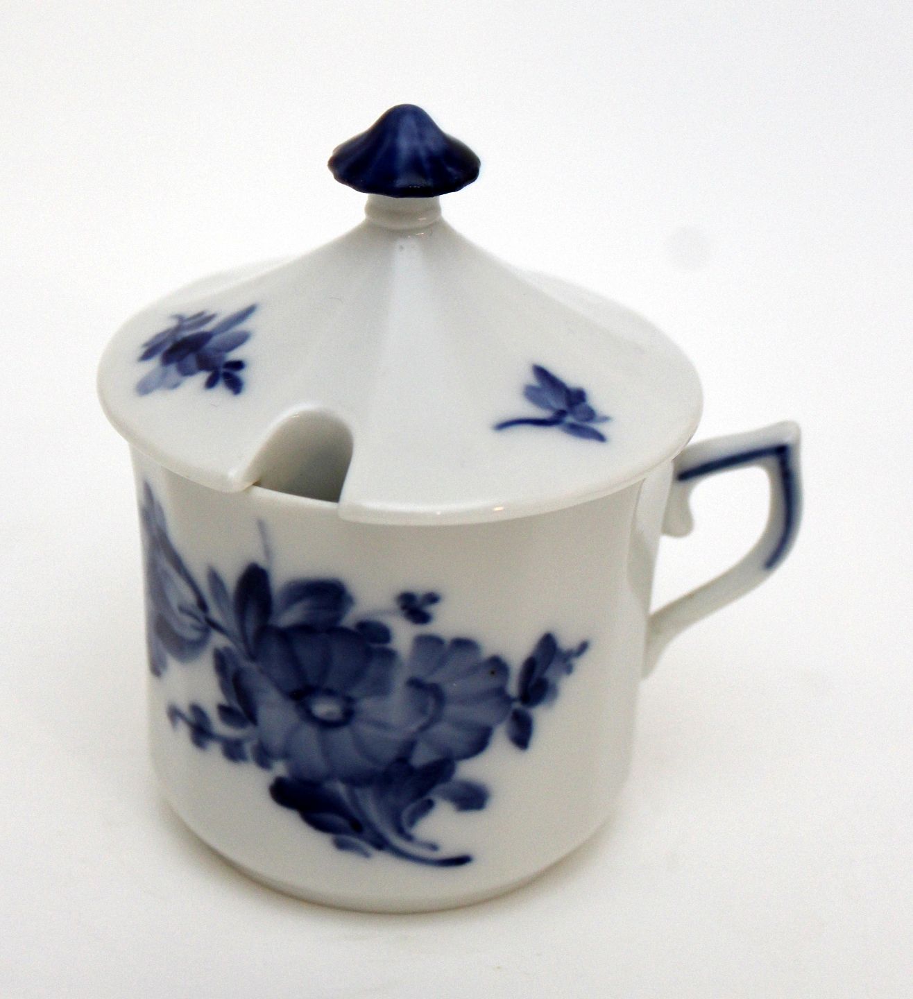 Text available in Danish: Cremekop/sennepskop, Blå Blomst kantet, Royal Copenhagen