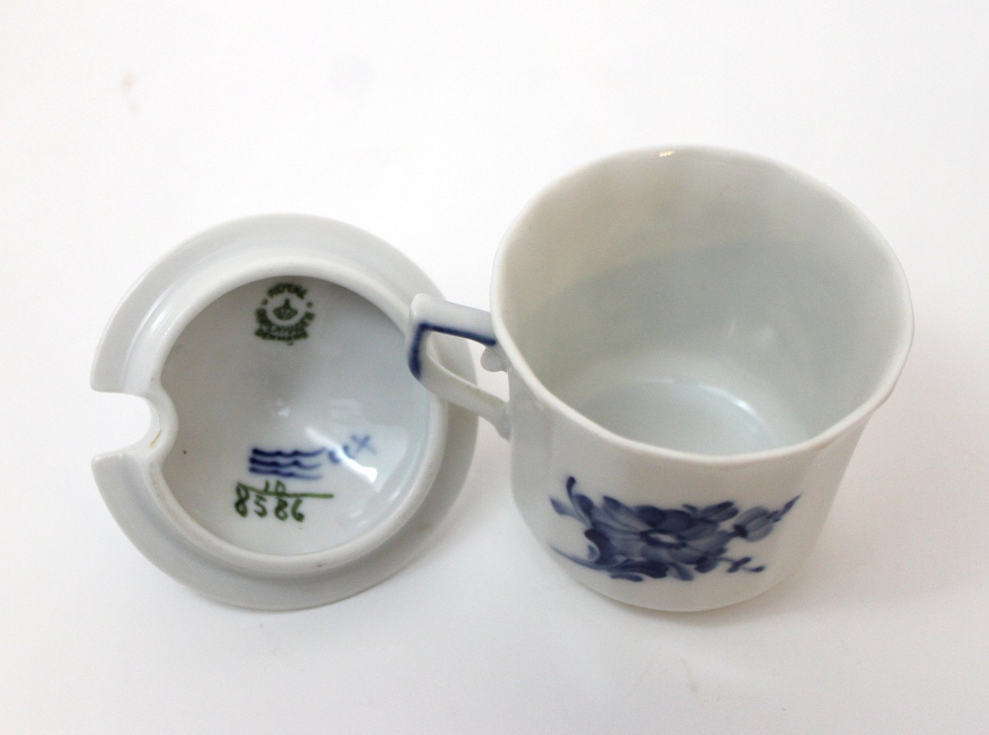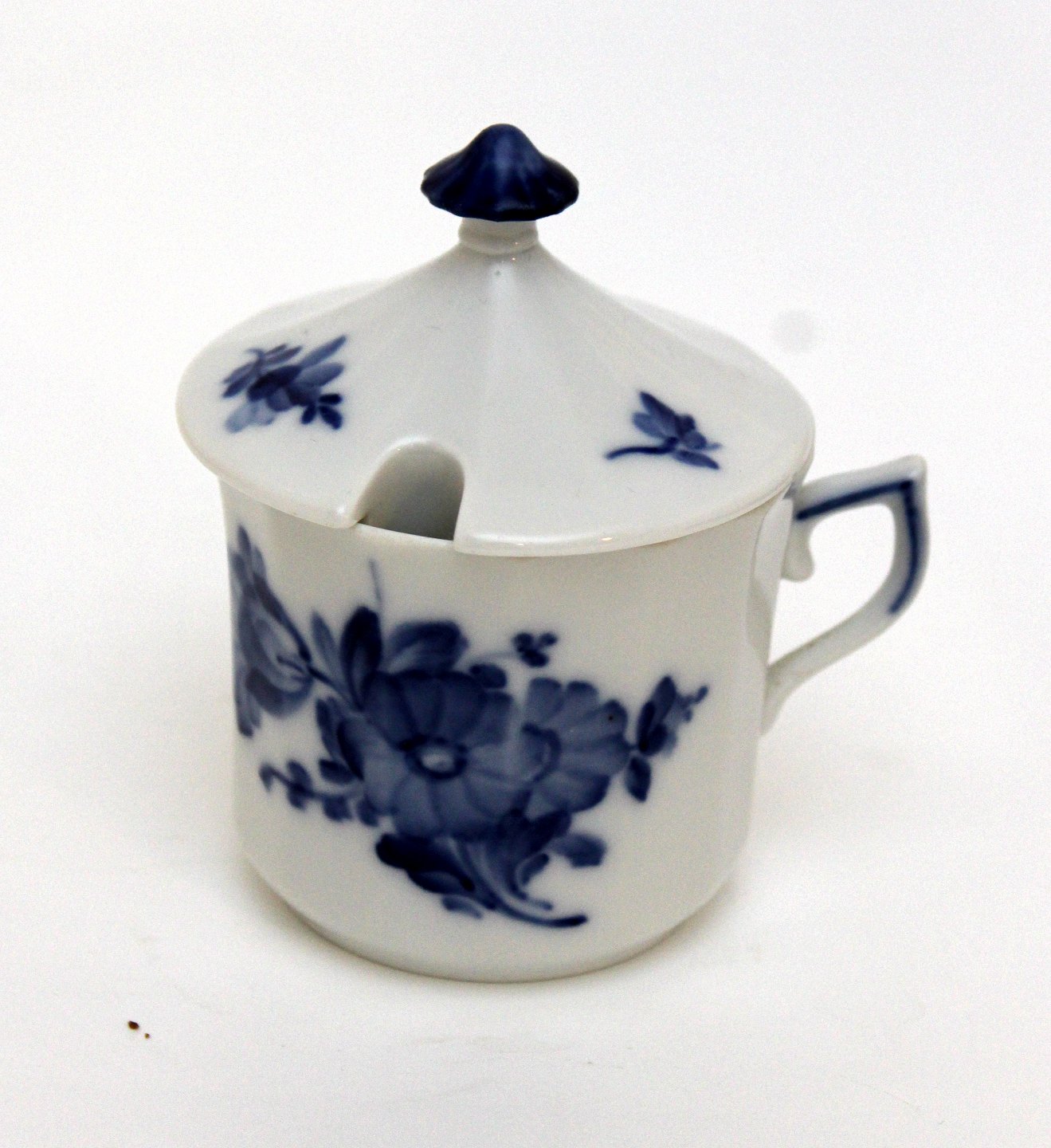 Text available in Danish: Royal Copenhagen, Blå Blomst kantet, Cremekop eller sennepskop med låg. Nr. 10/8586. Højde 9,5 cm. Diameter 6,5 cm. I. sortering. Fin stand. Pris: 375 kr. Lager: 1
