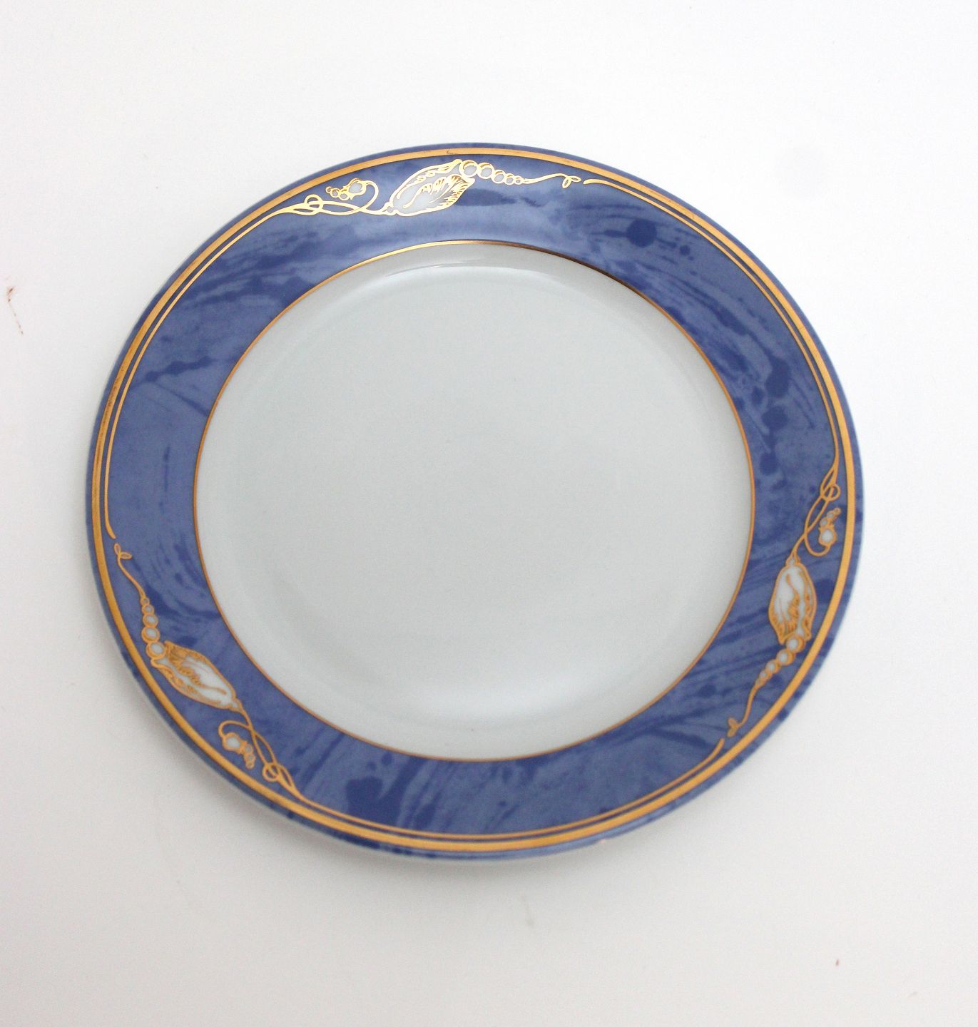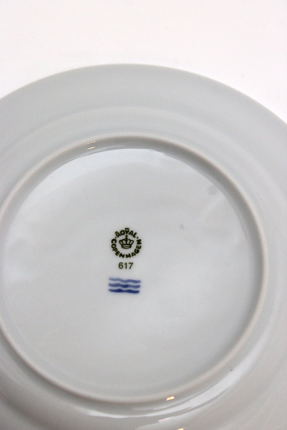 Text available in Danish: Royal Copenhagen, Blå Magnolia. Blå marmoreret bort dekoreret med gylden blomsterknop. Designet af Flemming Eskildsen. Stor kagetallerken. Diameter 17 cm. Nr. 617. I. sortering. Pris: 50 kr. stk. Lager: 6