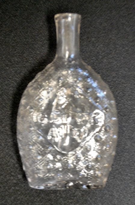 German pocket flask with a motif of a miner, 19th century. Clear glass. Nubbed glass. Embossed with the text "Glück Auf!" L: 15.5 cm.
