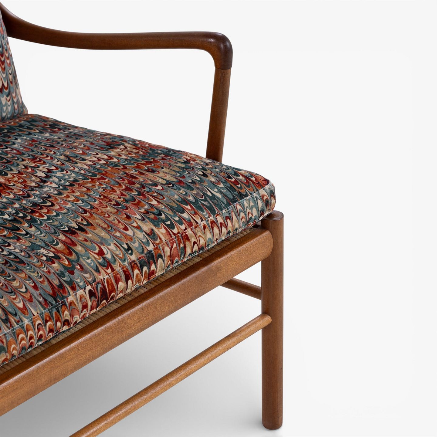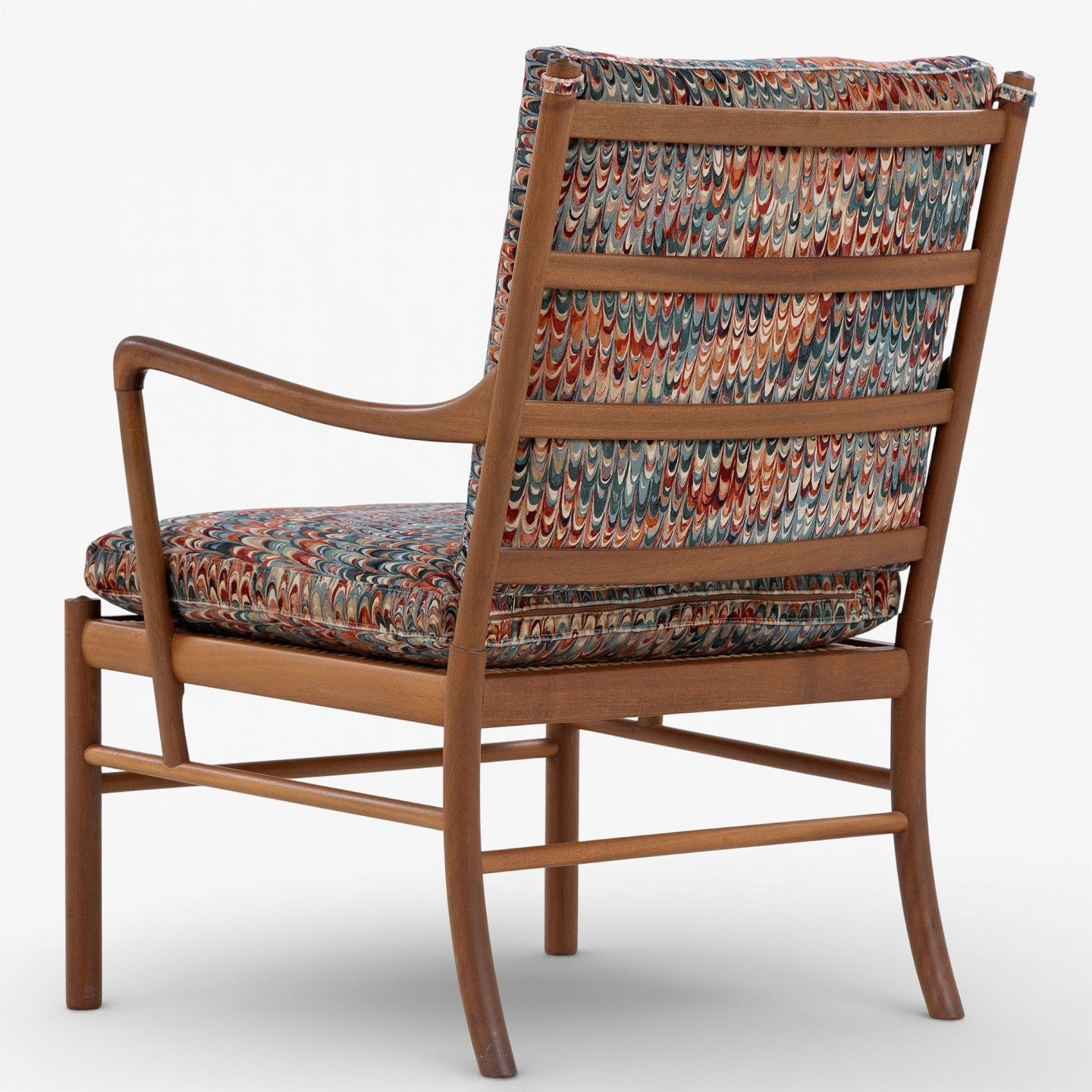 PJ 149 - 'Colonial Chair' armchair in patinated mahogany with newly upholstered cushions in 'End Paper Velvet' fabric. Manufacturer's mark.