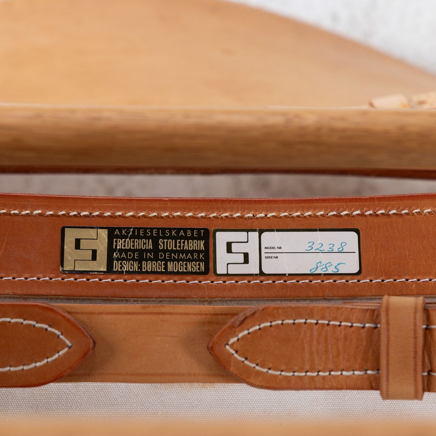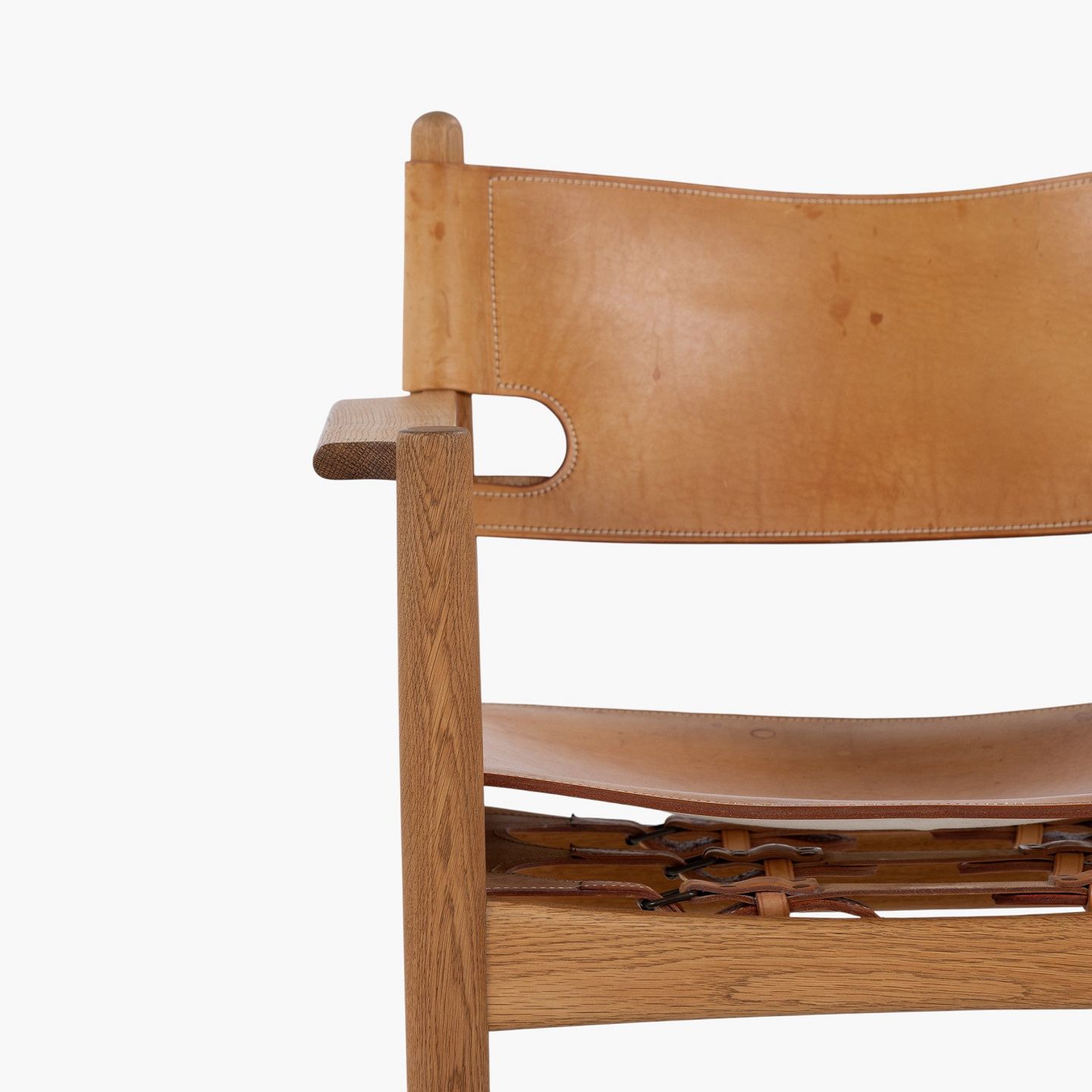 BM 3238 - 'Hunting chair' in patinated oak and full grain leather with armrests. Manufacturer's mark.