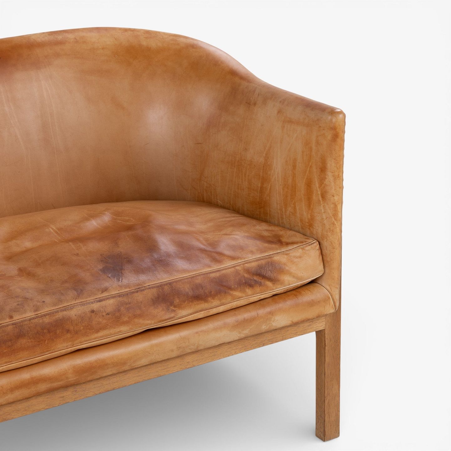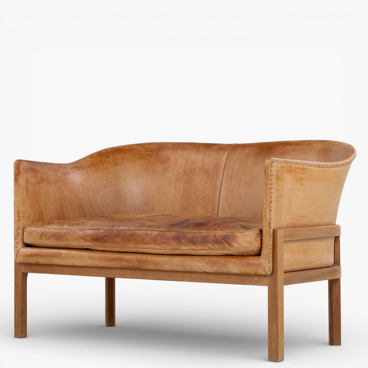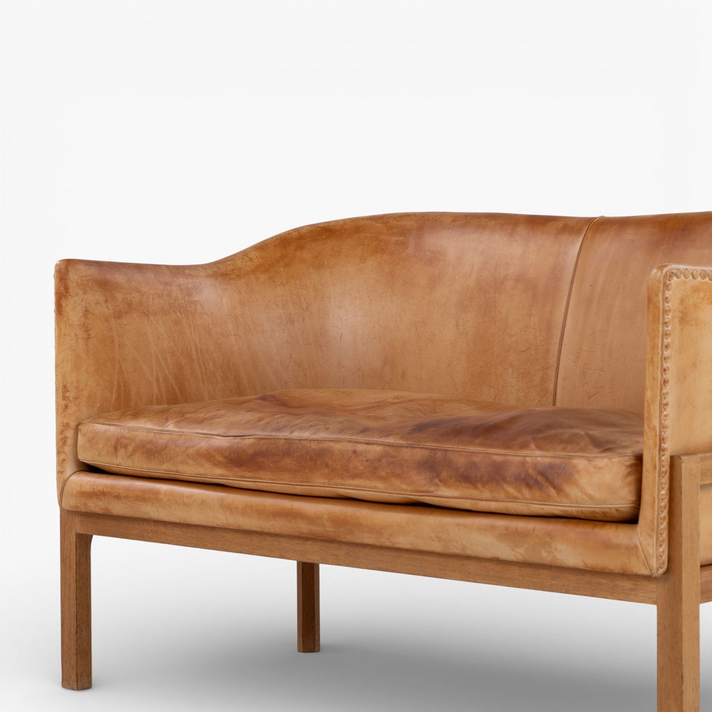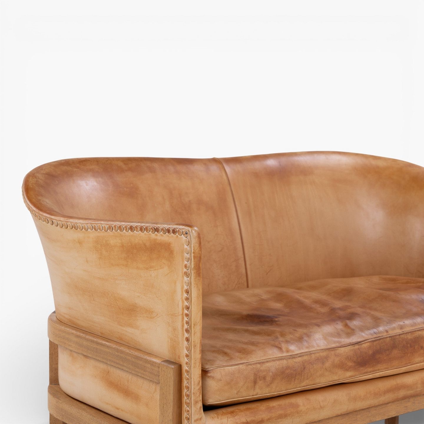 MK 52/2 - 2-seater sofa in patinated, stitched natural leather with a mahogany frame.