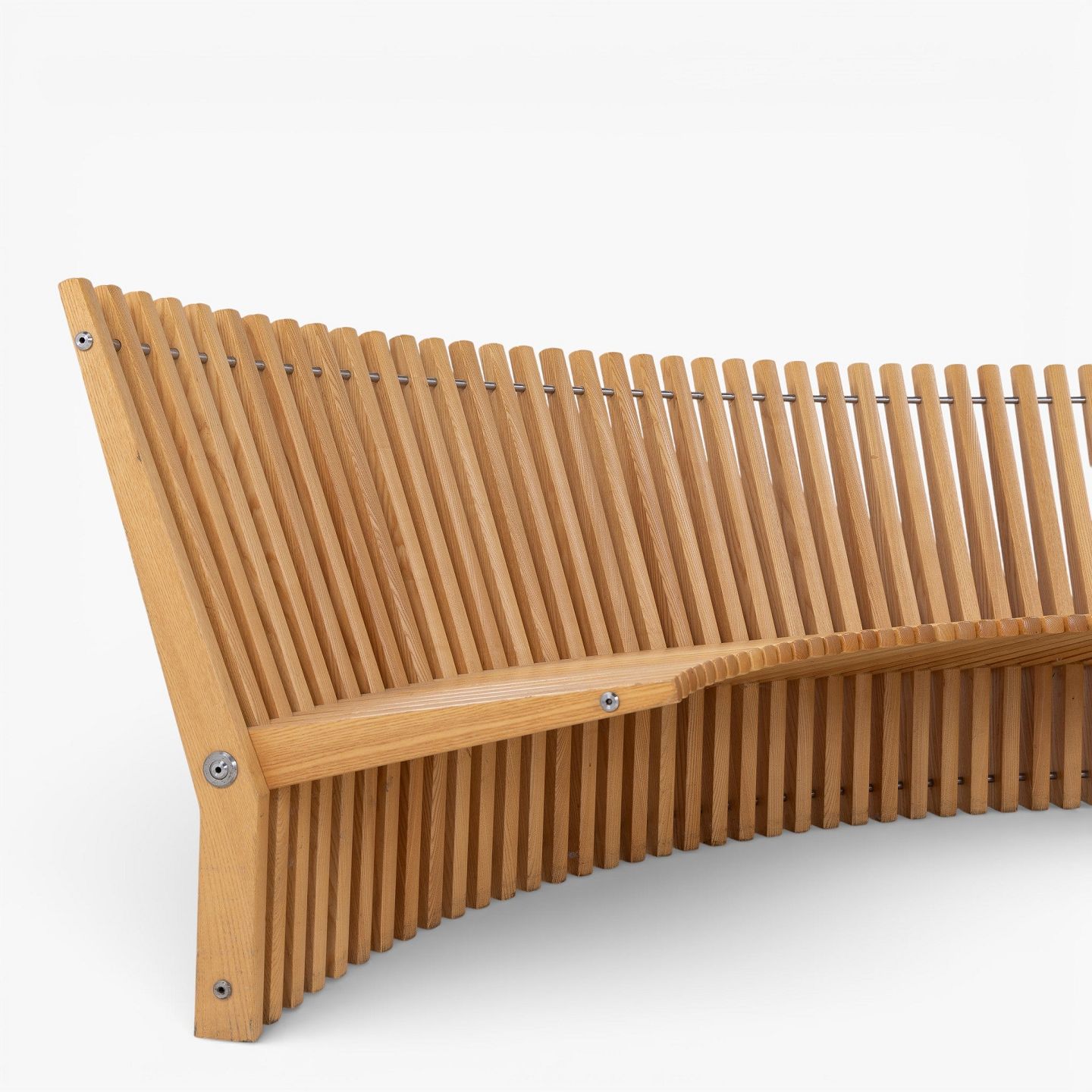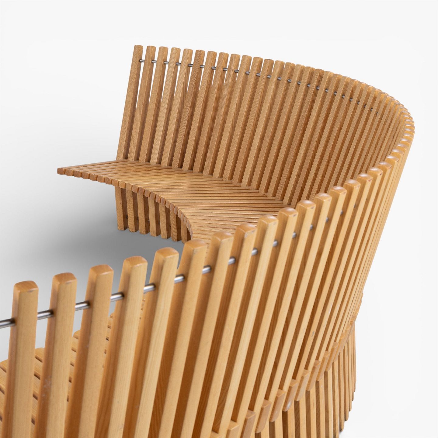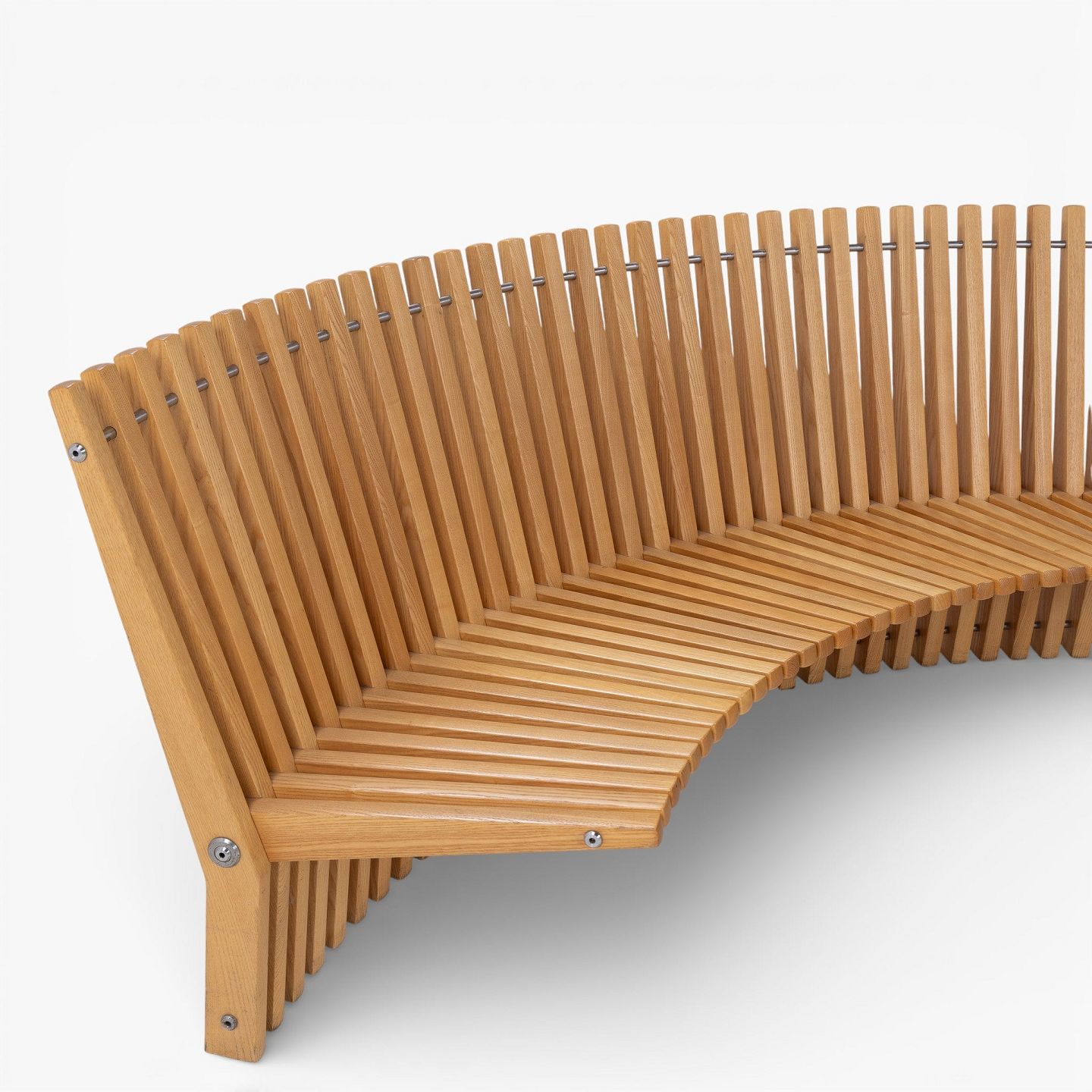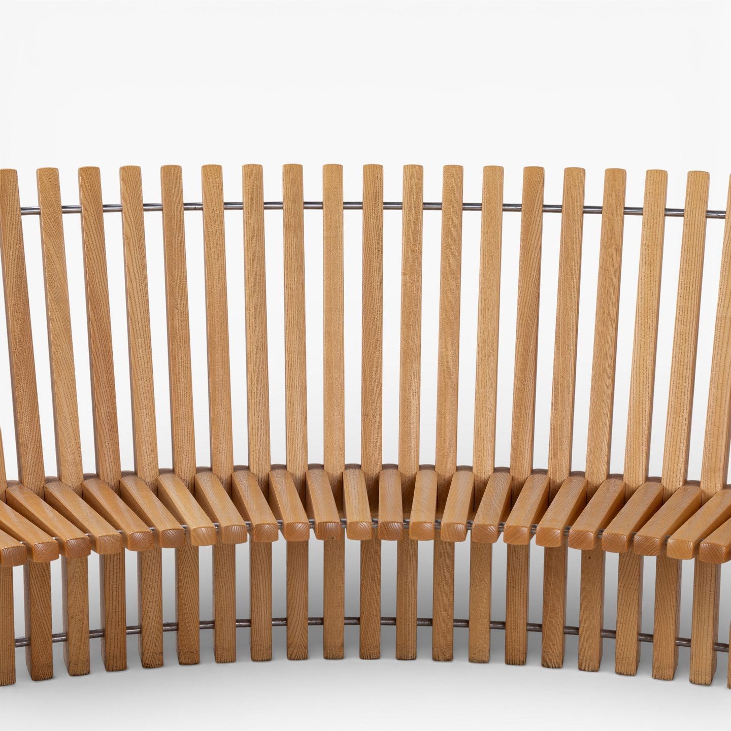 'Astral' bench in solid patinated elm wood in the shape of a semicircle. Designed in 1979.