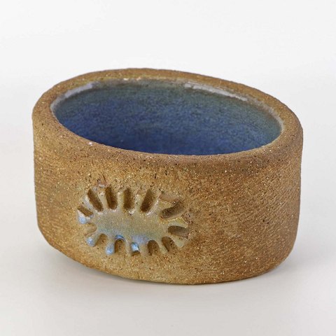 Lille oval skål i keramik med lysblå glasur på indersiden samt delvist glaseret sol mønster på ydersiden.