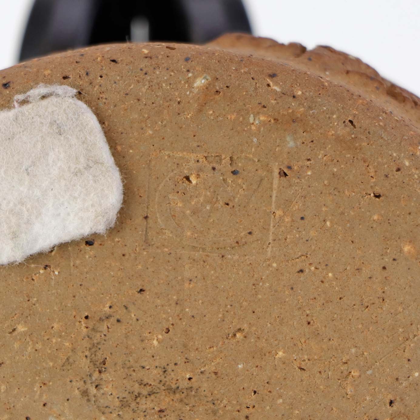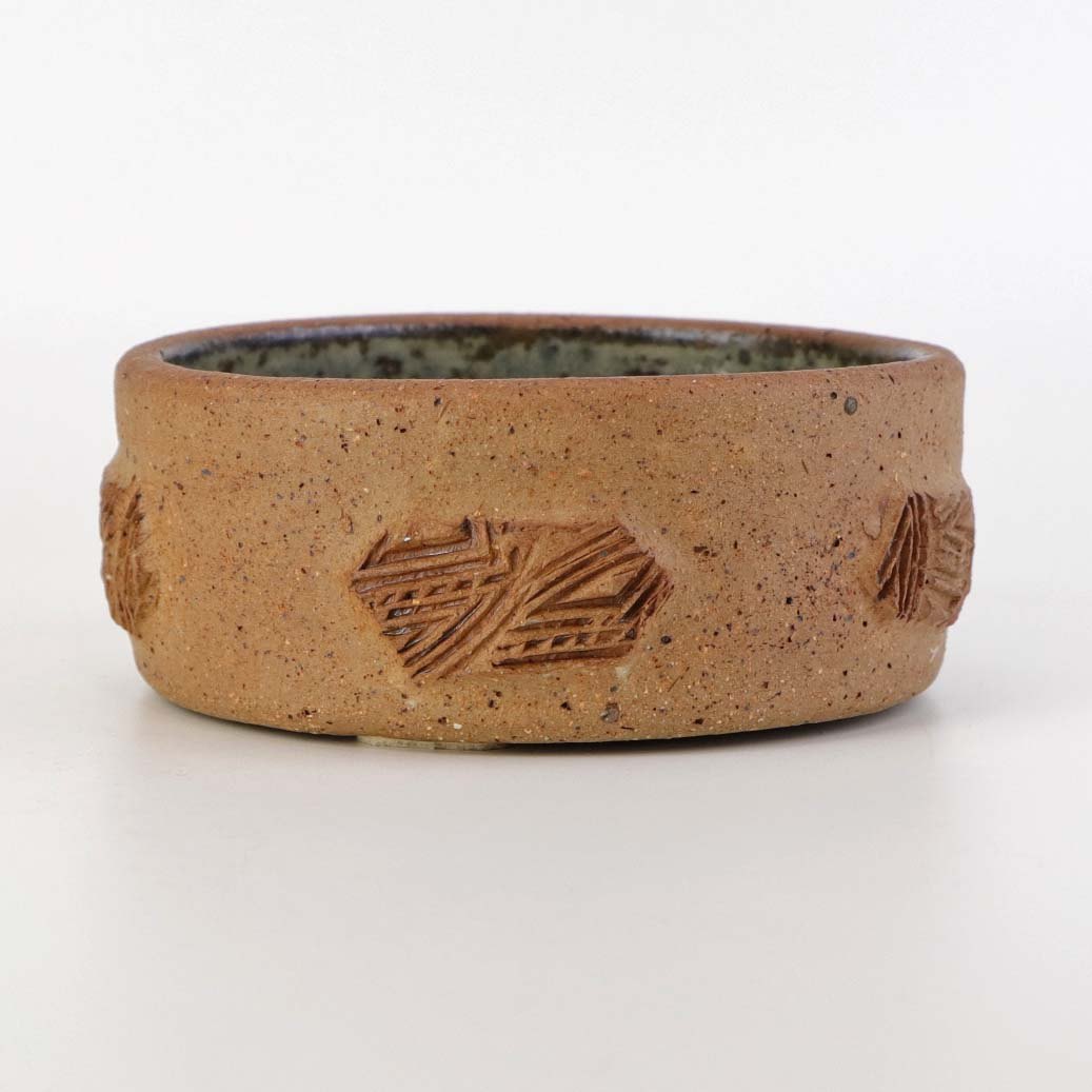 Lille rund skål i keramik med grå glasur på indersiden samt abstrakt mønstret yderside i uglaseret keramik.