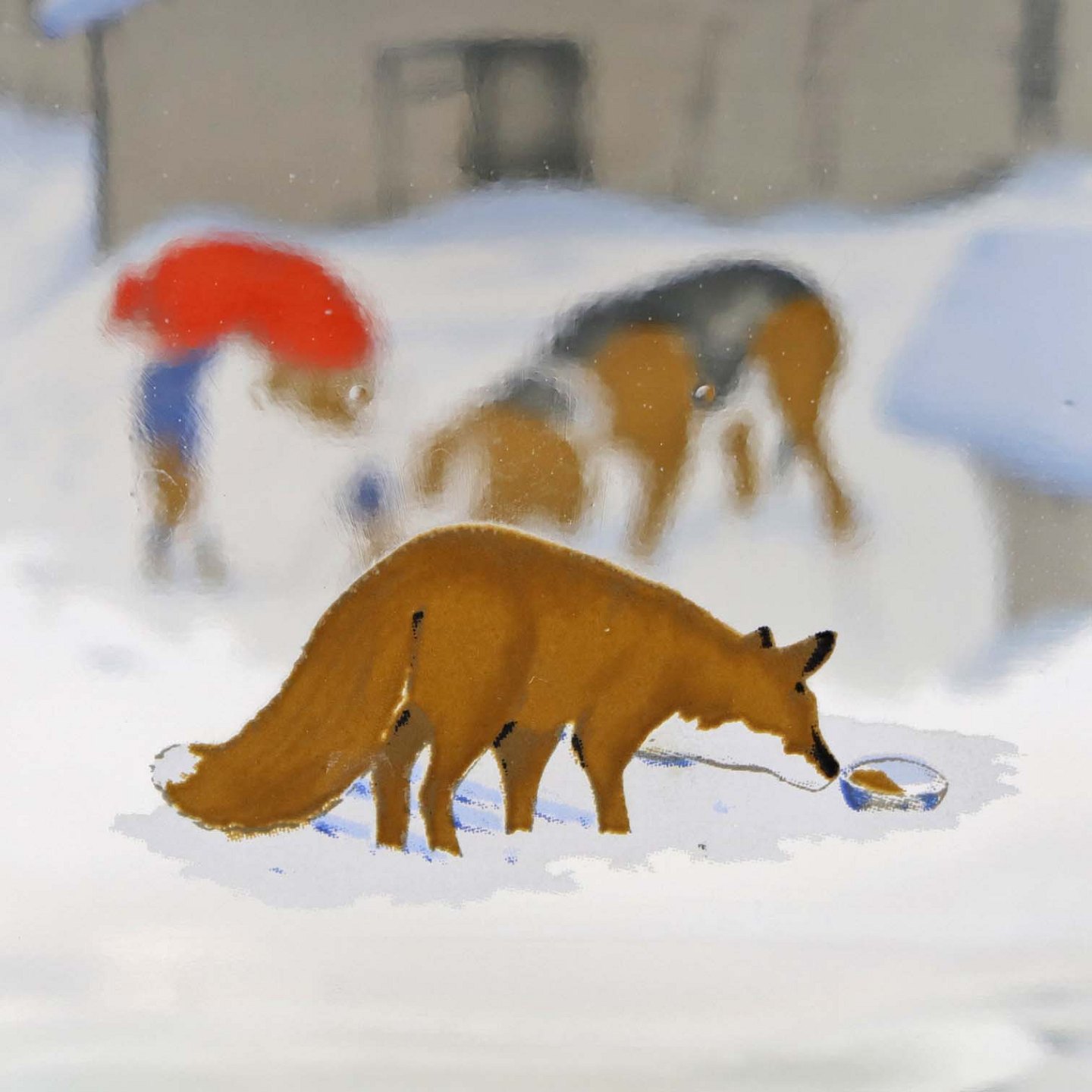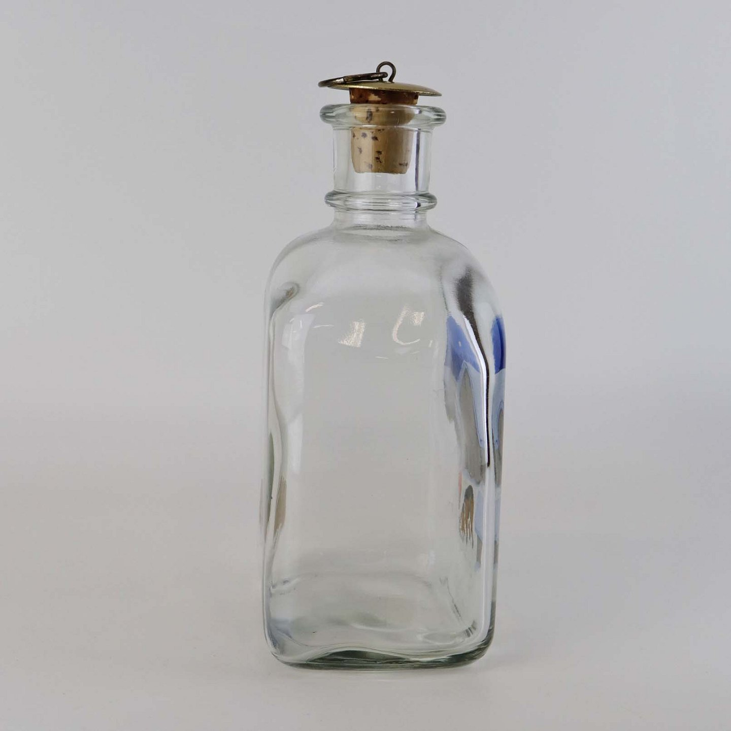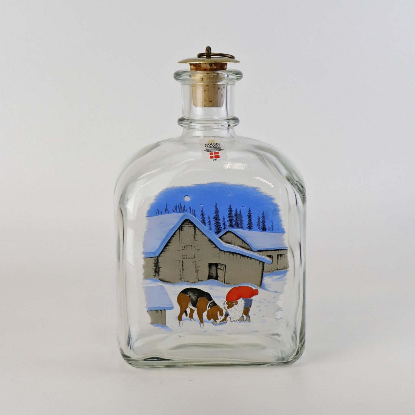 Dramflaske i glas med julemotiv af Nisse, hund og ræv efter tegning af Harald Wibergs. Snapseflasken kommer med korkprop.