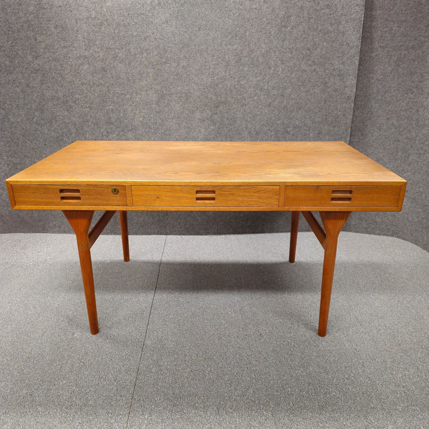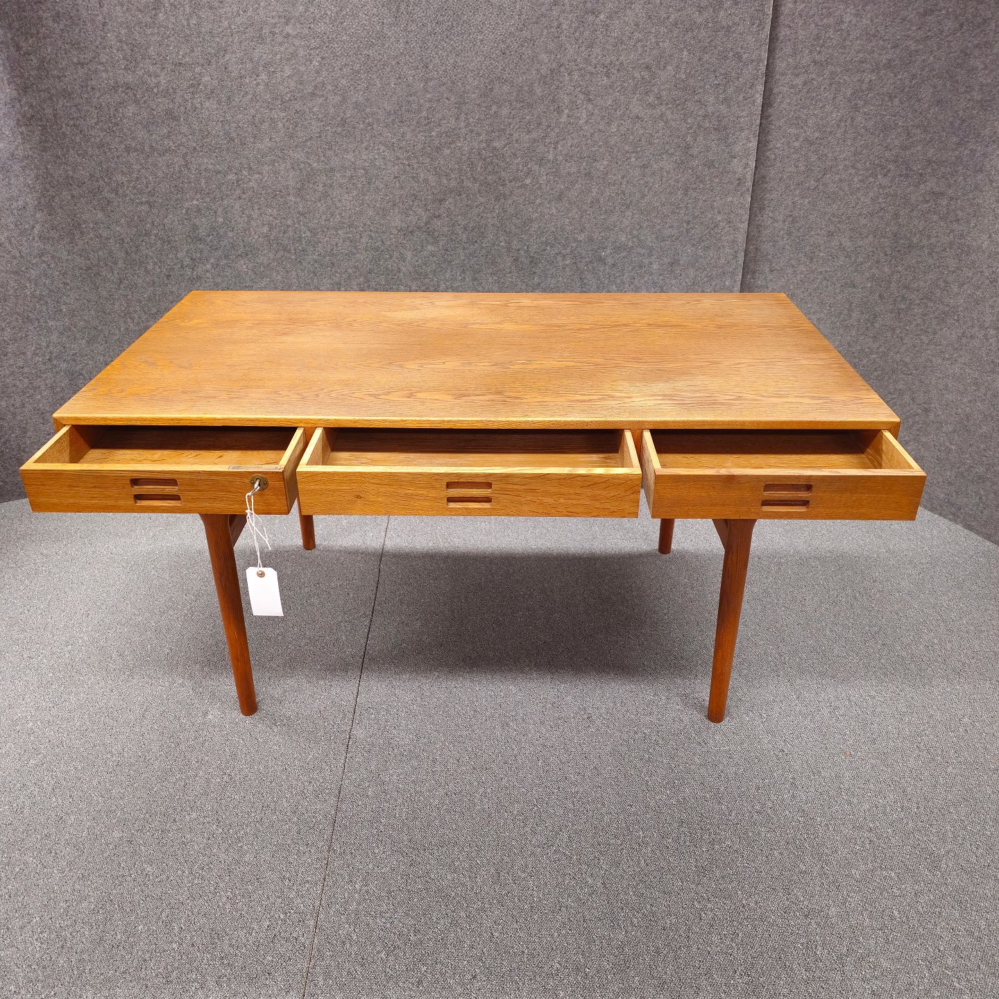 Skrivebord model ND93 i eg med tre skuffer, venstre skuffe med nøgle