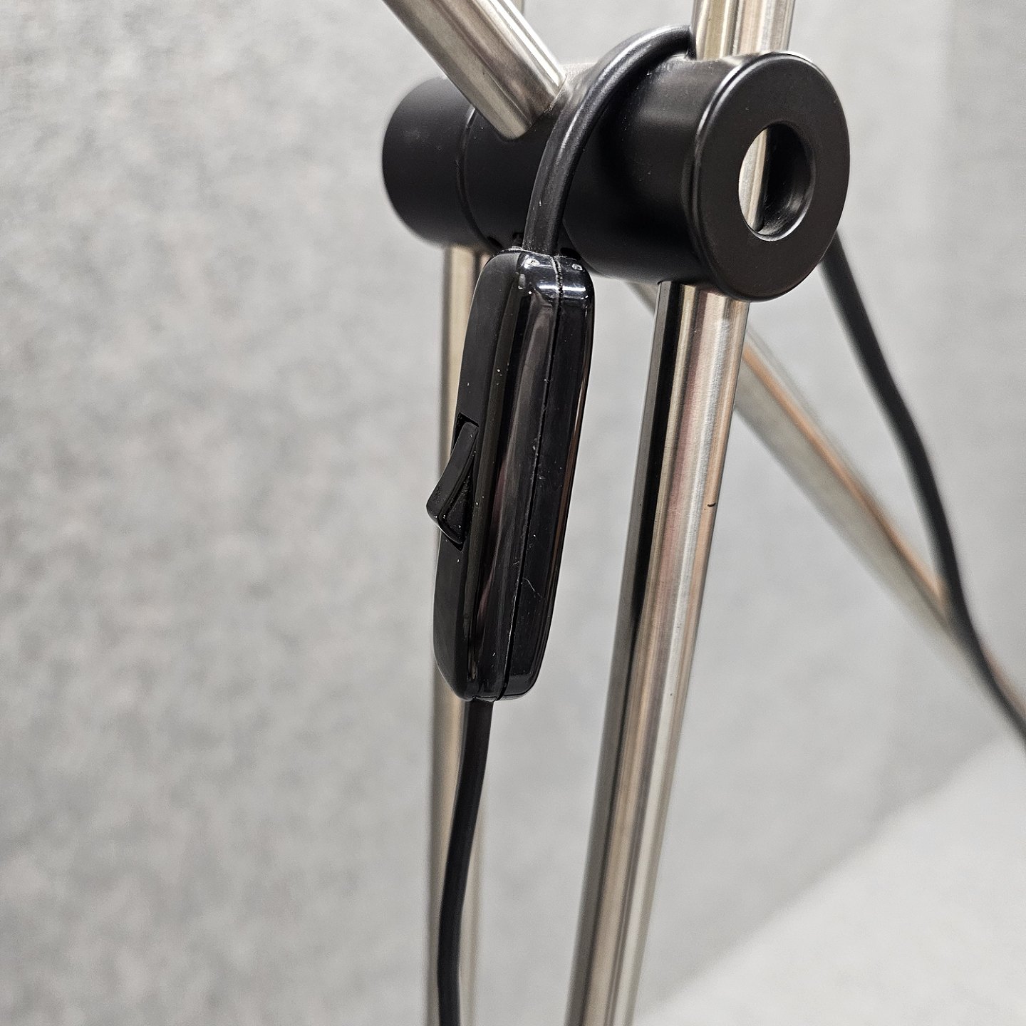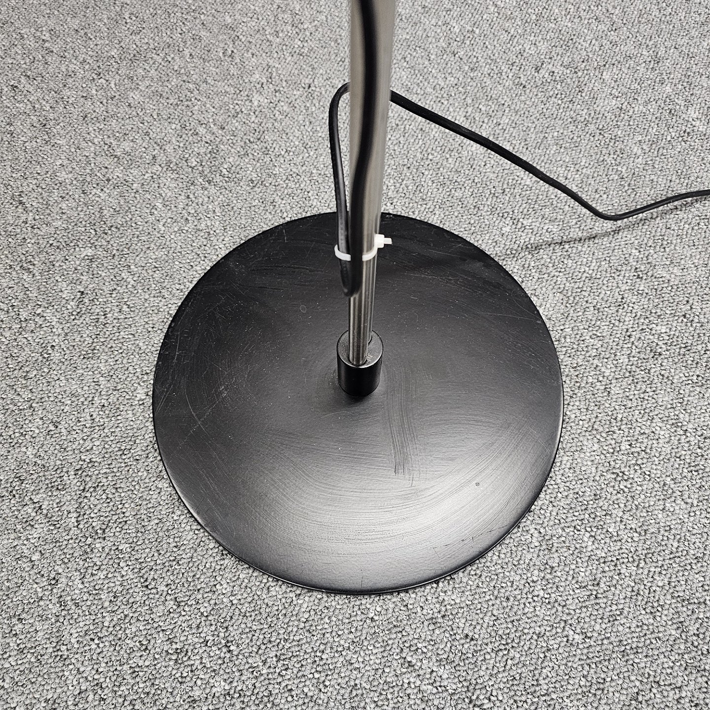 Gulvlampe i metal med sort fod, sort ledning og hvid skærm