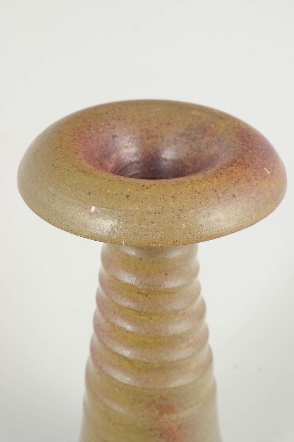 Slender sculptural vase in stoneware with a matte, sand-toned glaze and subtle surface variations. The ribbed body creates a strong architectural and balanced expression. Signed with a monogram in the clay.