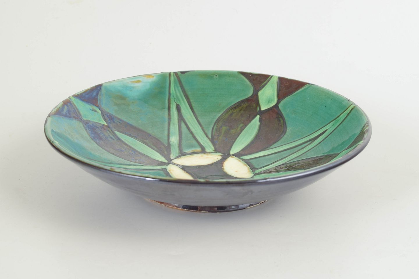 Hand-glazed faience bowl with geometric decoration in green and brown tones. A classic Art Deco expression with strong workshop character, featuring a vibrant glaze and hand-painted details.