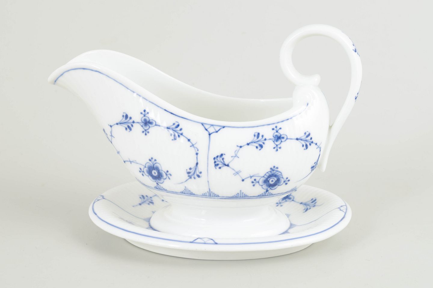 Blue Fluted Plain is Royal Copenhagen’s oldest pattern, introduced in 1775. The ribbed form combined with hand-painted underglaze decoration has for generations been a hallmark of Danish porcelain craftsmanship. Sauce boats of this type formed a natural part of the formal dining table around 1900 and exemplify the service’s functional elegance and timeless character.