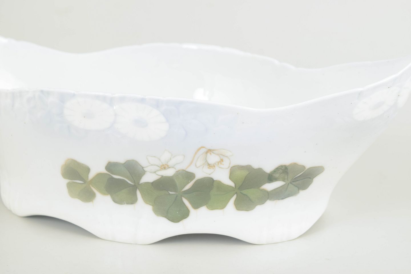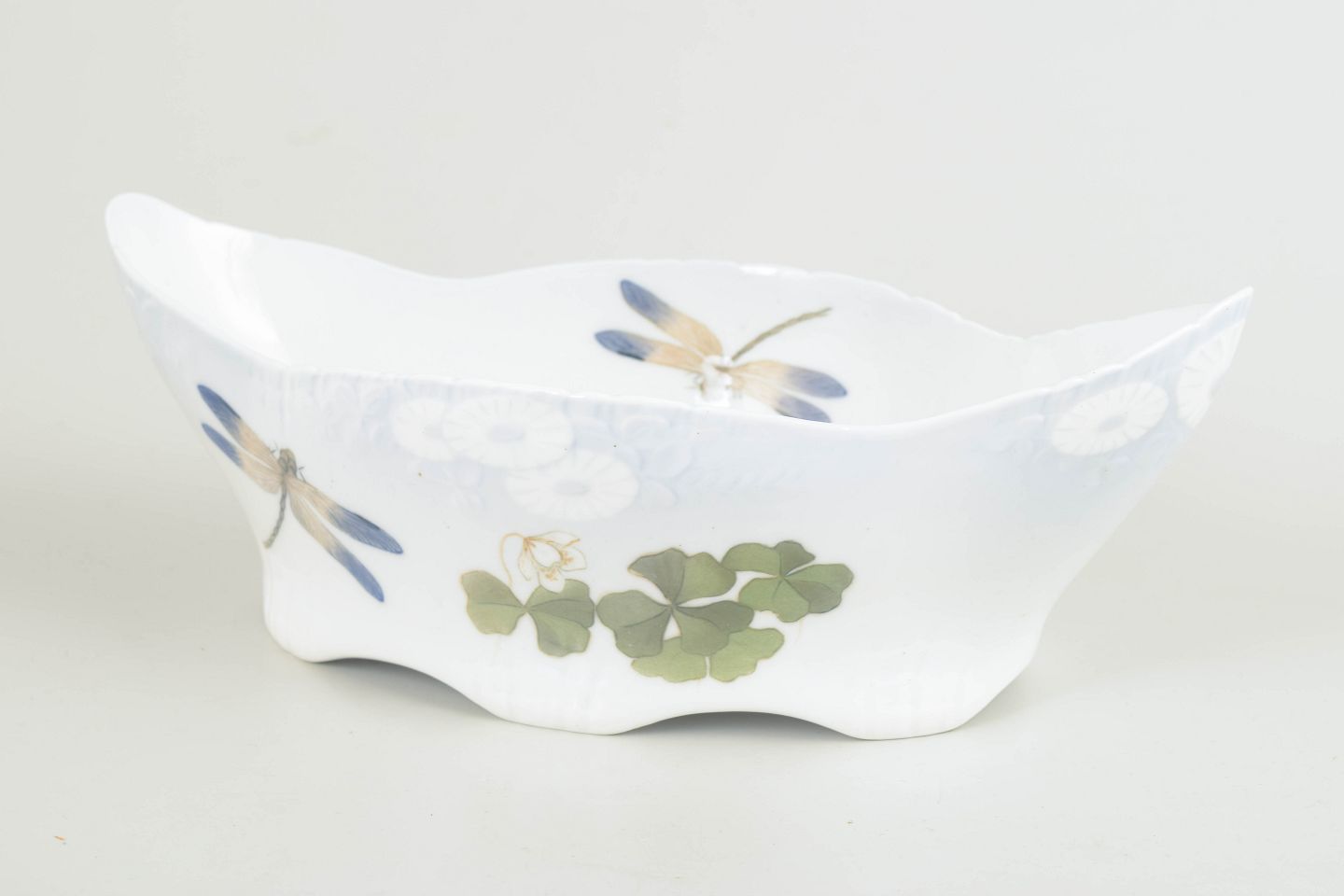 Softly shaped porcelain jardiniere executed in the Art Nouveau style with an organic, undulating contour and hand-painted decoration featuring butterflies and foliage motifs. A decorative planter from the early 1900s, characteristic of the period’s nature-inspired design language.