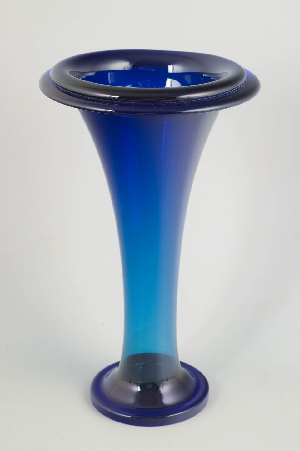 Elegant trumpet-shaped vase in mouth-blown, heavy crystal glass with a deep blue colour graduation. A striking example of Czech Art Deco glass with a solid foot and wide flared rim.
