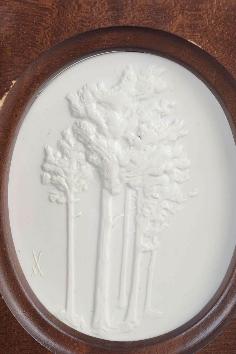 Relief plaque in white biscuit porcelain with a stylised nature motif depicting trees, mounted in a rectangular wooden frame with an oval opening. The matte surface enhances the fine modelling of the relief, giving the piece a classical sculptural character.