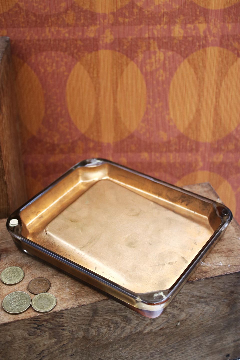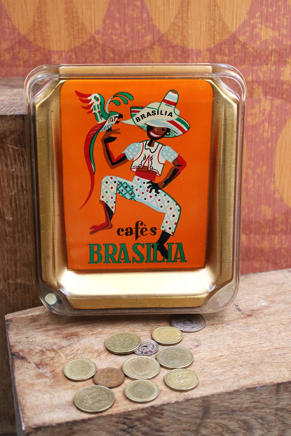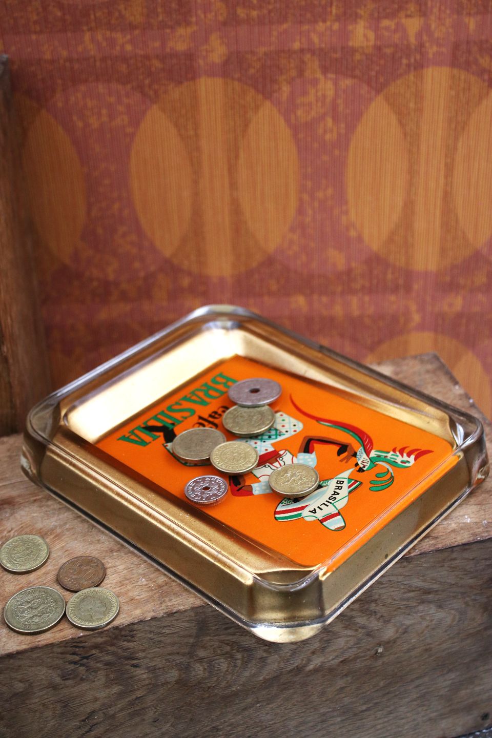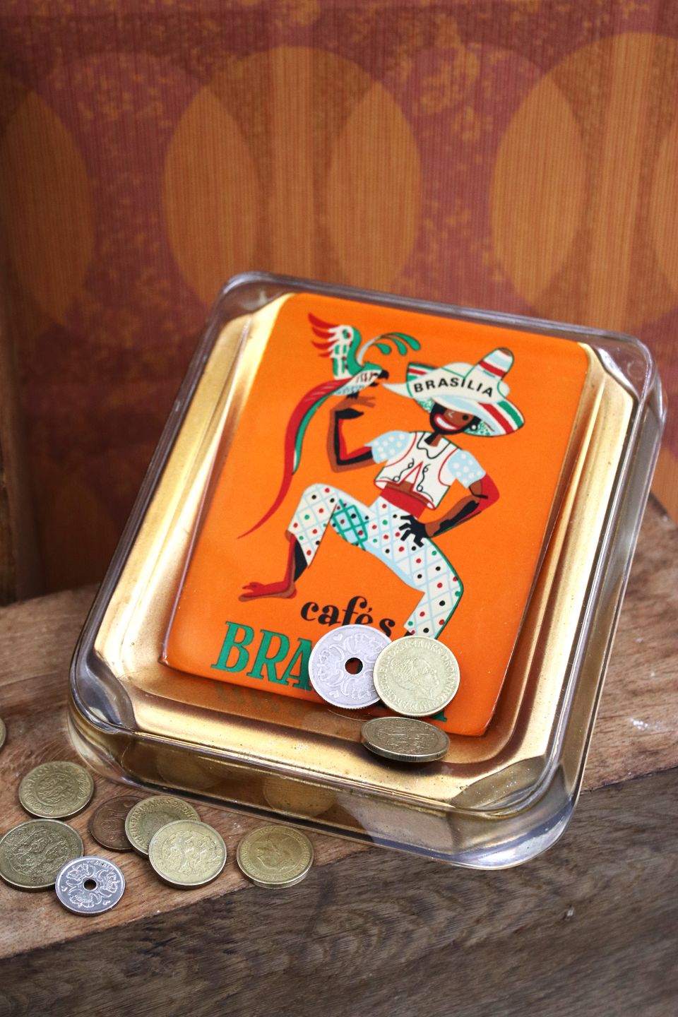 Old money dish from a coffee shop in the 50s/60s in thick glass with a motif of a Brazilian man with a parrot...