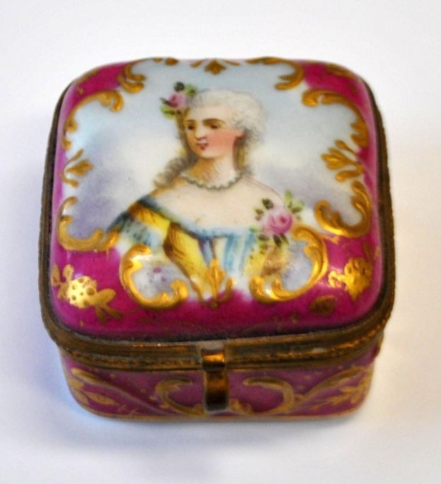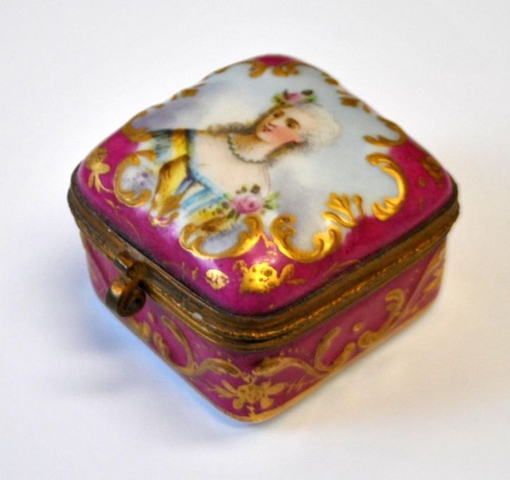 Sevres porcelain pill box, 19th century. France. Hand-painted porcelain with rococo woman. Light red with rococo gilding. Gilded inside. 4.5 x 4.5 x 3 cm. Perfect condition!