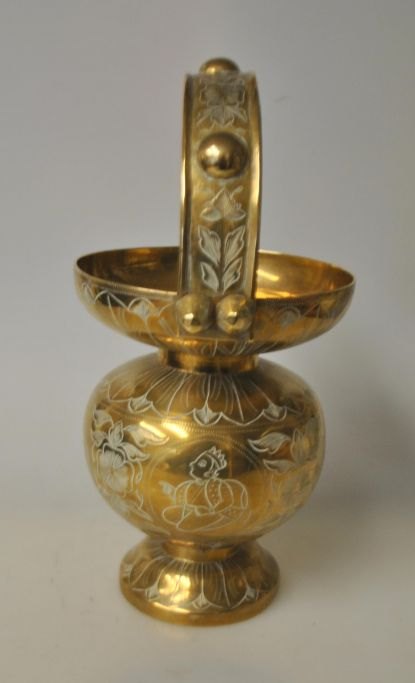 Indian brass vase with handle, circa 1950. With engraved decorations of a seated prince and flowers. H.: 21 cm.