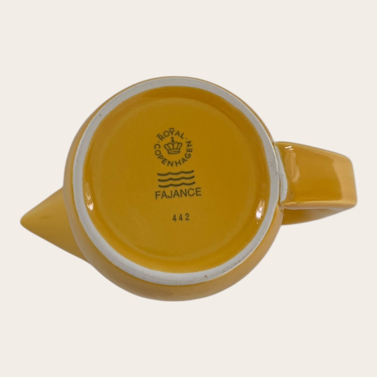 Royal Copenhagen, Aluminia, Ursula, Jug with handle, Yellow #442, 1st sorting, 13.5cm high, 17cm wide, Design Ursula Munch Petersen *Good condition* (see also lid for jug item no. 629130)