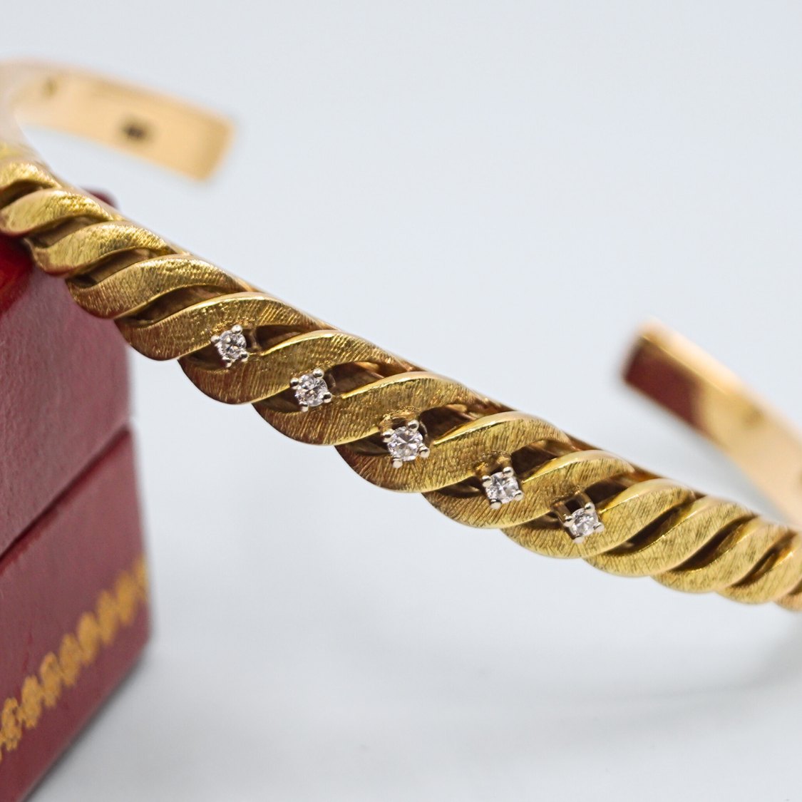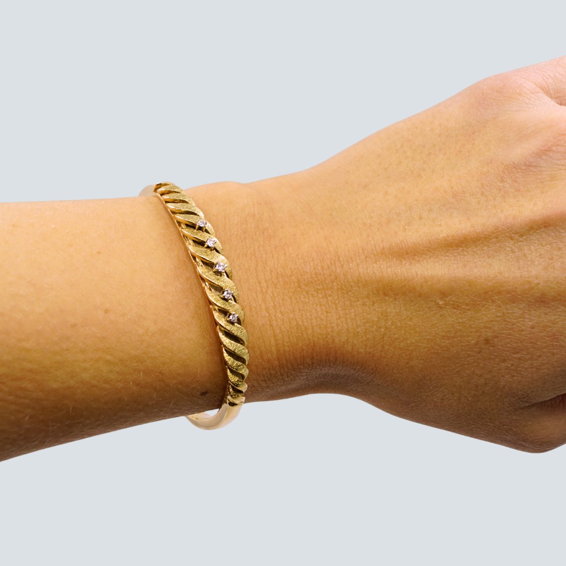 Gold bangle in 14k gold set with five diamonds mounted in white gold.