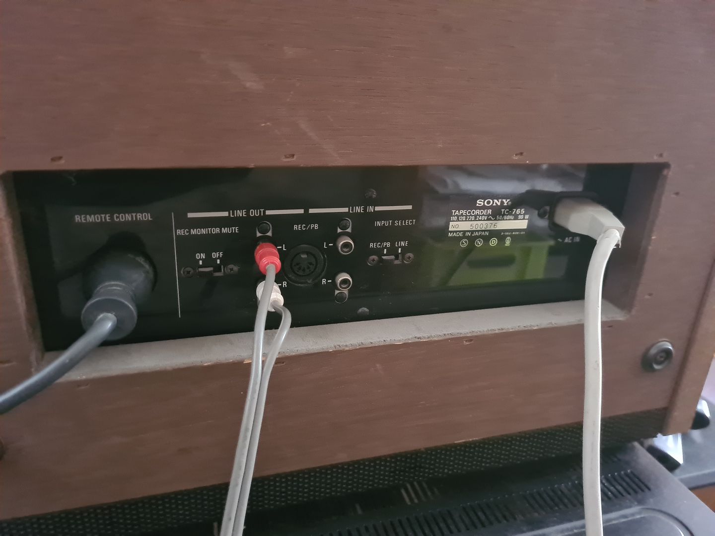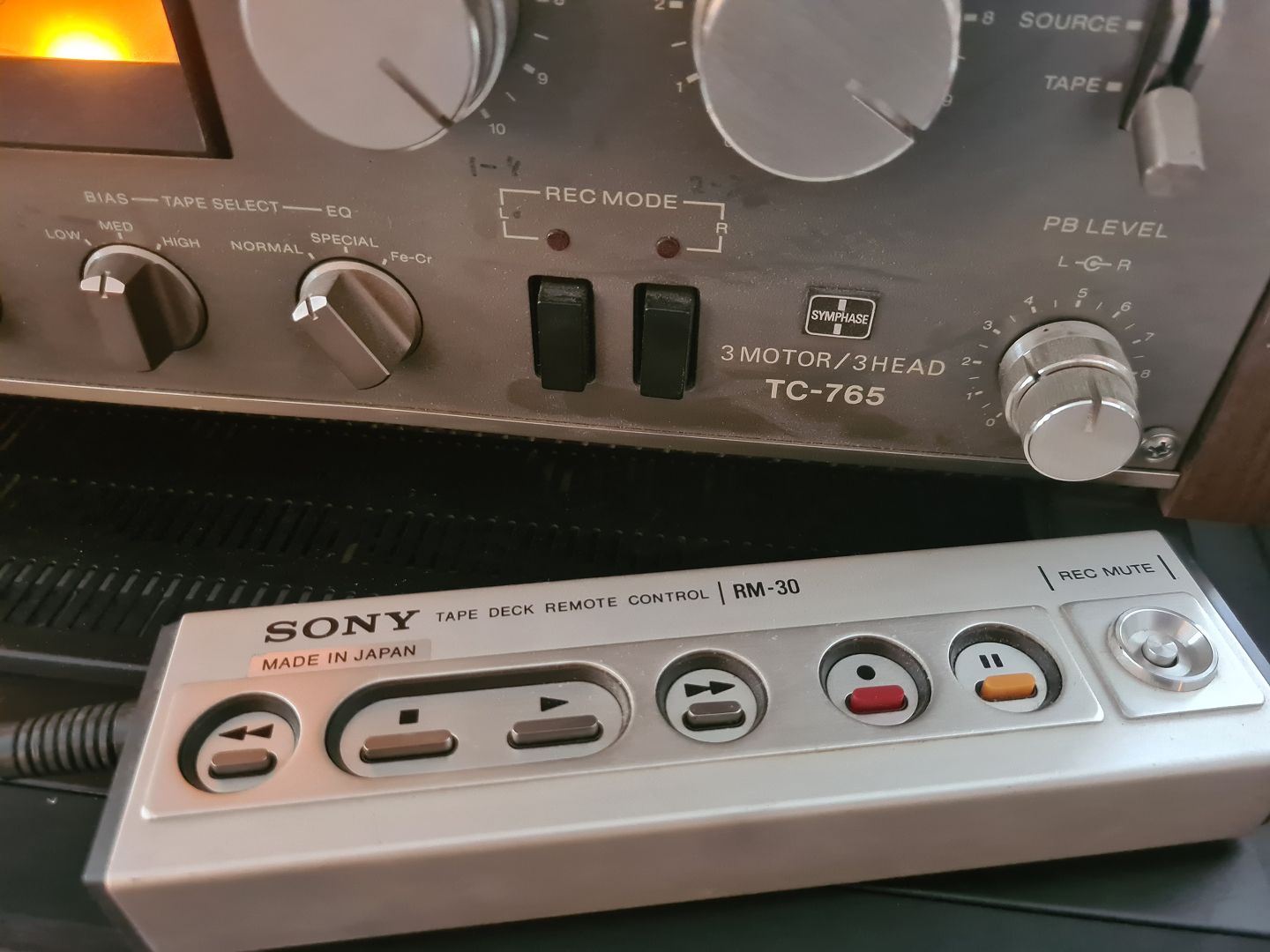 Text available in Danish: Spolebåndoptager fra Sony model TC-765. Fremstillet i 1979 og virker fint. Den kunne nok godt bruge en anelse service for at fremstå optimalt. NB svagt indridset på fronten. (Billede) Fjernbetjening model medfølger GM-30 medfølger. Den er ligeledes testet : Rewind virker ikke. Pause sporadisk og resten virker fint.