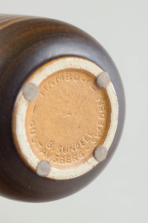 Decorative faience vase with hand-painted, stylised decoration, characteristic of Britt-Louise Sundell’s work for Gustavsberg during the 1960s. The form is restrained and well balanced, with an emphasis on surface decoration and colour typical of Swedish mid-century modern design.