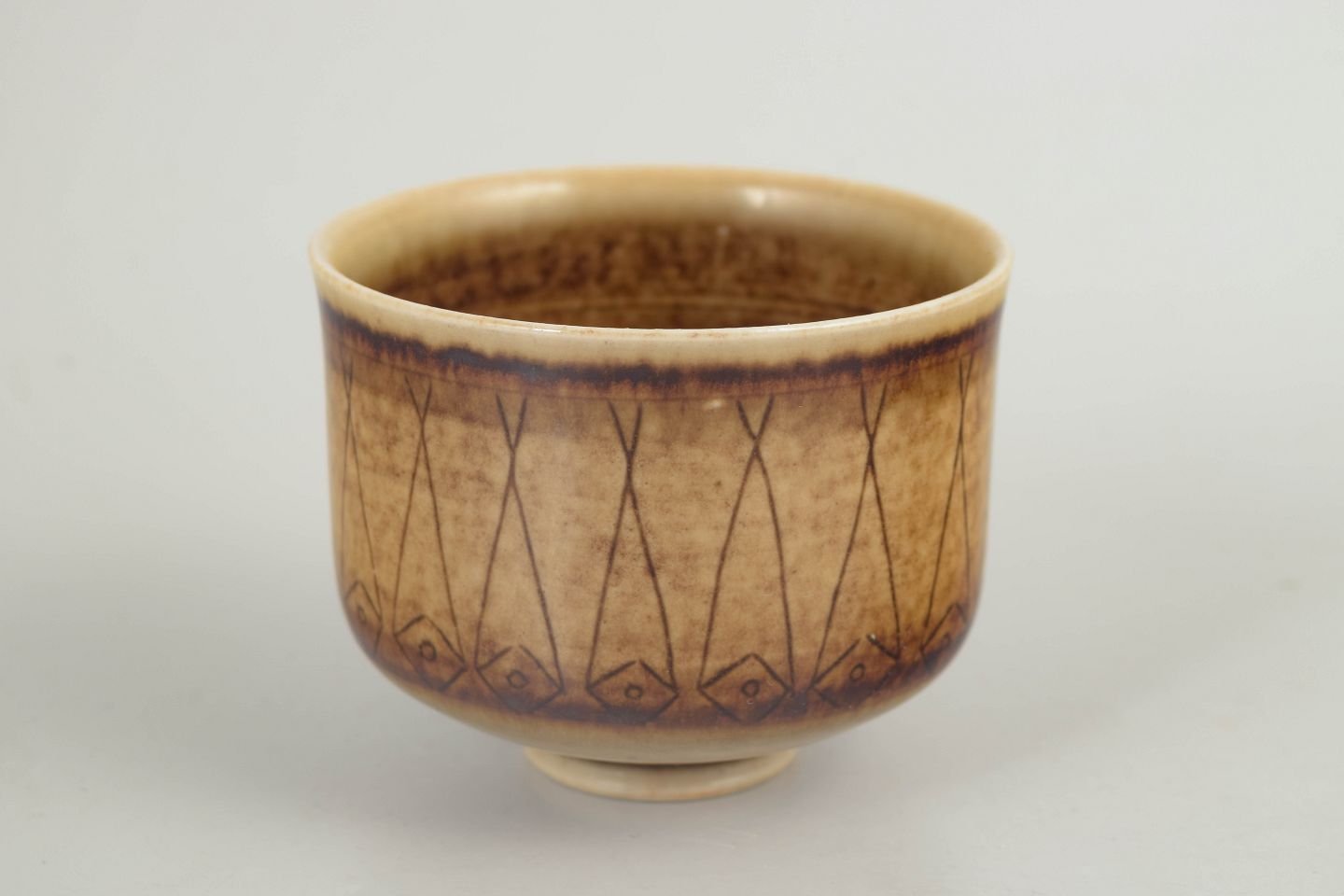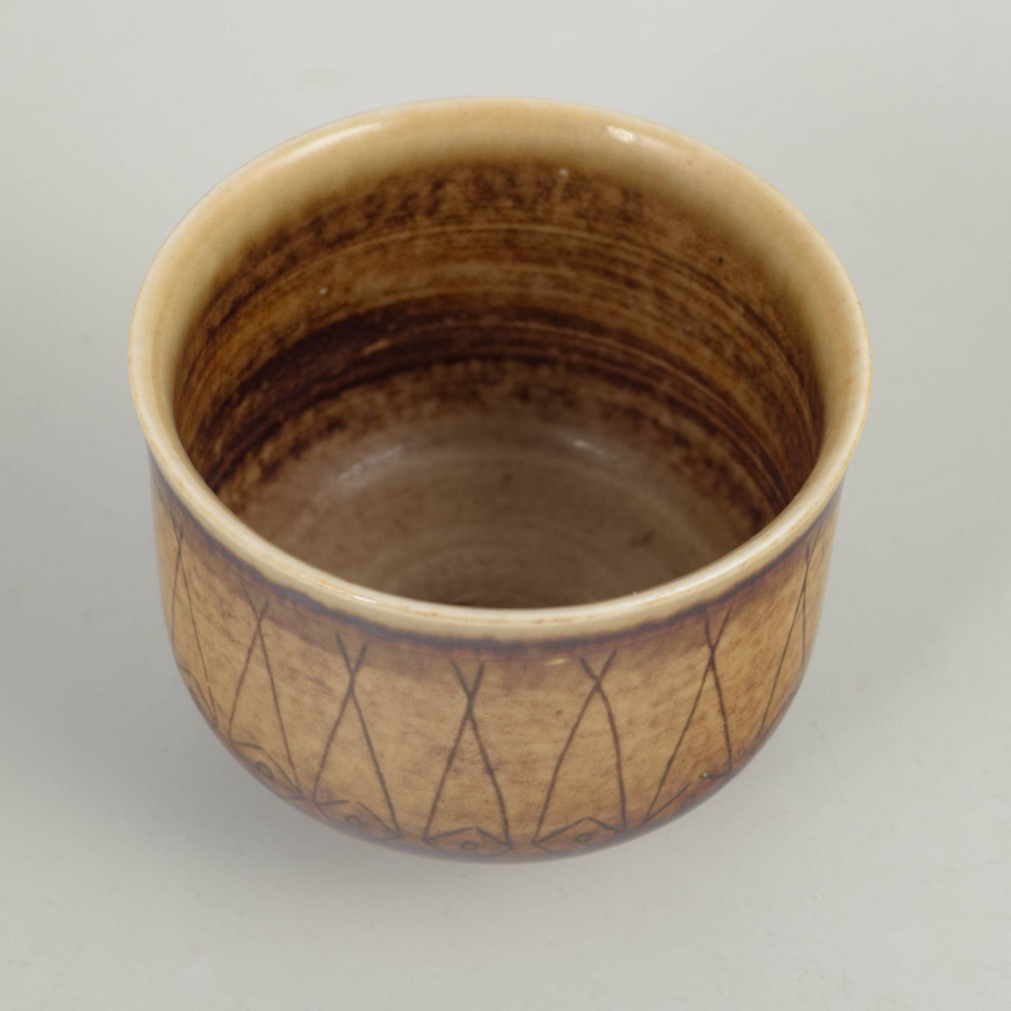 Thrown stoneware bowl with a small foot and a rounded body. Finished with a warm brown-toned glaze and incised geometric decoration in repeated vertical panels around the exterior. The interior shows a denser, lively glaze surface. Signed to the base and produced at Höganäs in the 1970s.