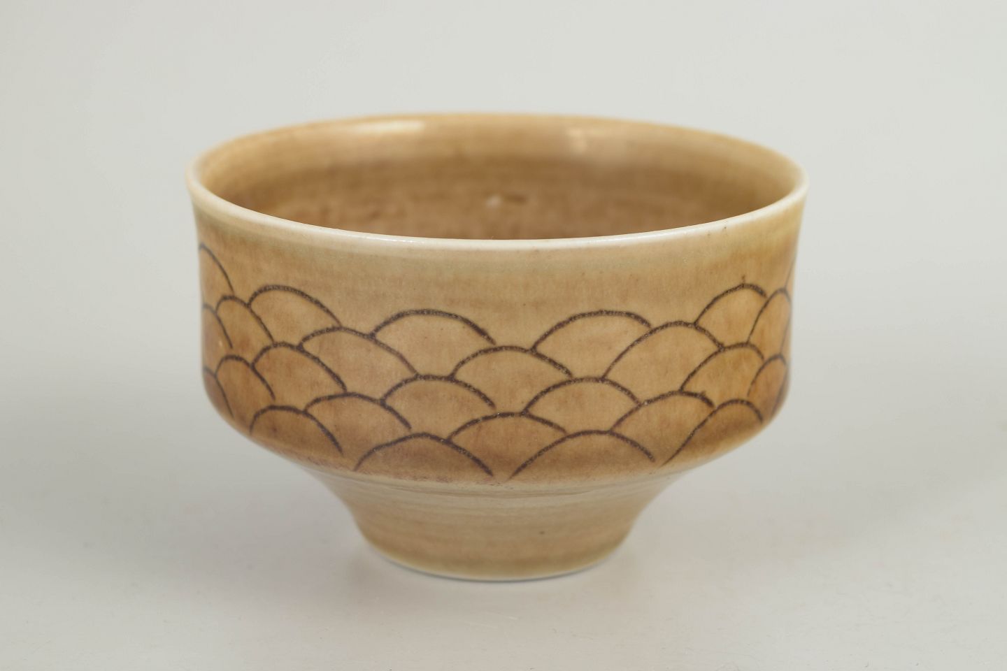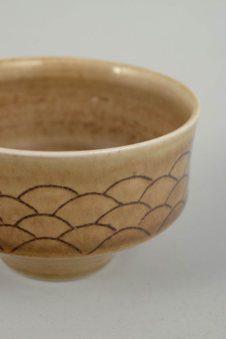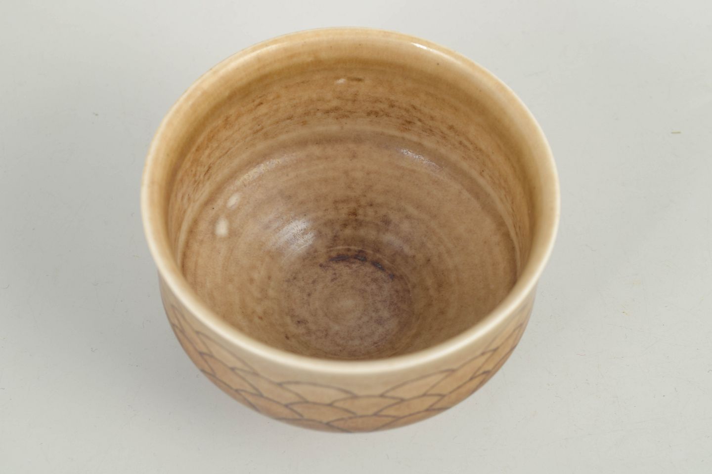 Thrown stoneware bowl with a gently flared rim and a warm sand-coloured glaze, decorated with an incised scalloped pattern around the exterior. Signed to the base, produced at Höganäs in the 1970s.