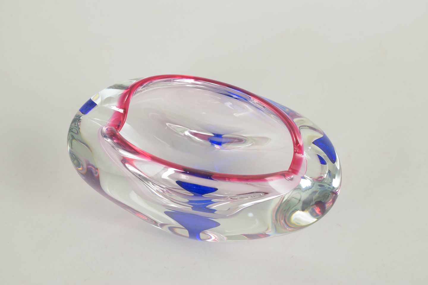 Organic-shaped bowl in mouth-blown art glass using the layered sommerso technique. Clear glass with encased blue and pink colour fields, creating depth and a distinctive floating play of colour. Typical Murano work from the 1960s/70s with soft, sculptural lines.