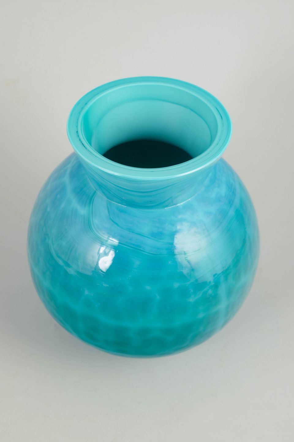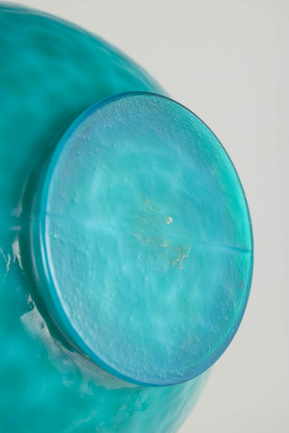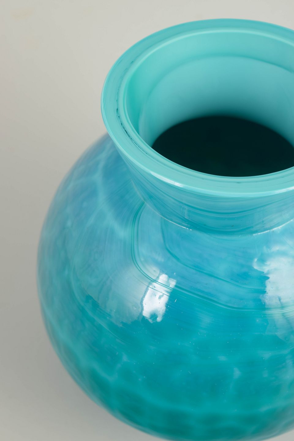 Globular vase in turquoise art glass with lively swirling colour movement and a high-gloss finish. Made in the “Malanit” series, featuring a softly balanced silhouette and a gently flared neck, characteristic of Swedish art glass from the 1980s.