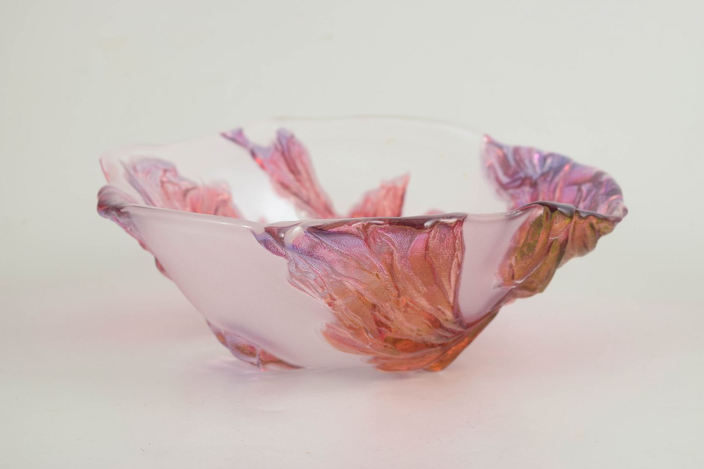 Mouth-blown art glass bowl with an organic, gently undulating form and a softly upturned rim. Decorated with applied, leaf- or petal-like elements in pink, purple, and amber tones, creating a lively, sculptural presence.