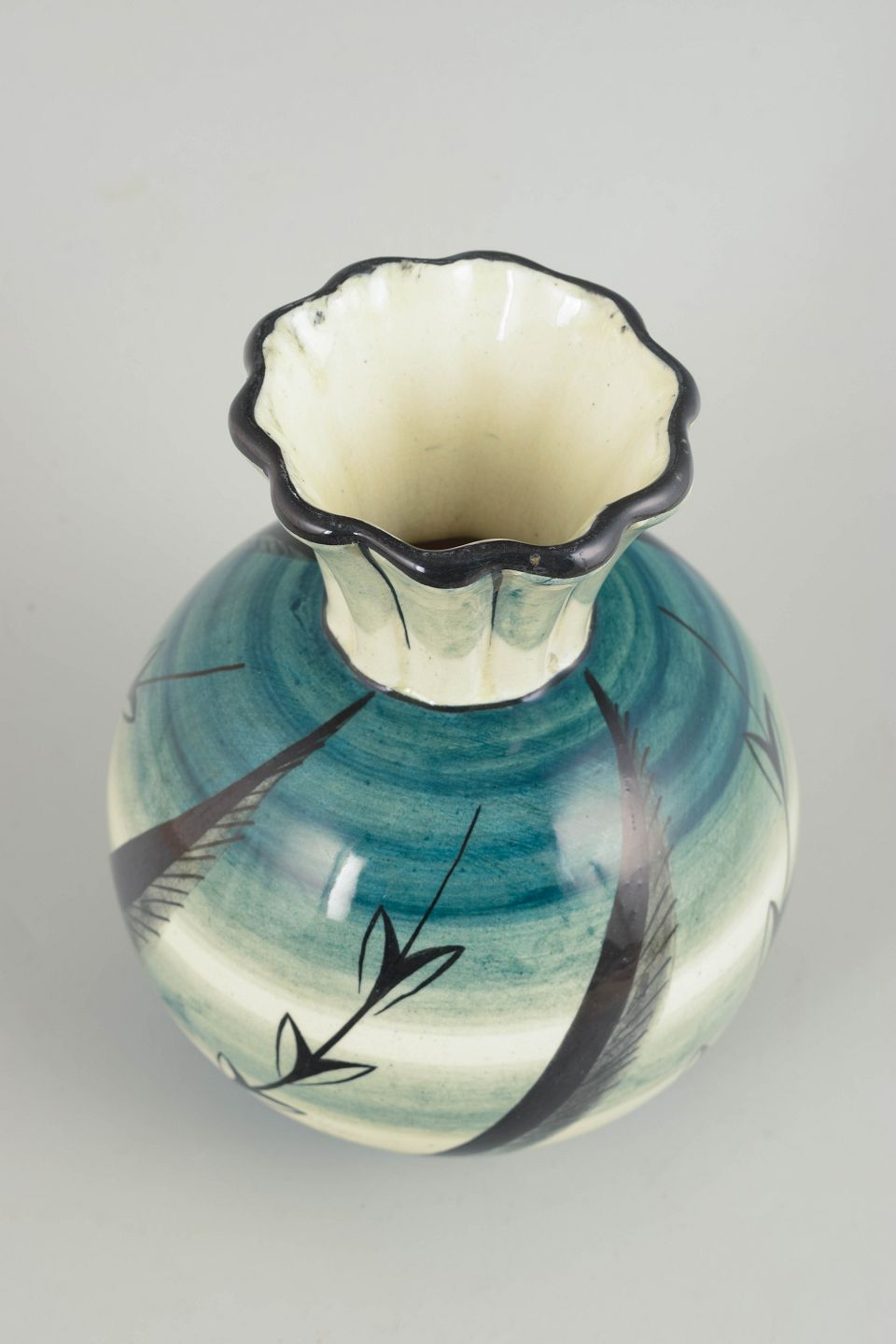 Art Deco faience vase with a well-balanced, rounded body and a slender neck with a softly undulating rim. Decorated in characteristic blue-green tones with stylised plant motifs and fine brushwork, executed in the distinctive “Löja” decoration developed during the 1930s. The model is a clear example of Swedish Art Deco, combining natural inspiration with graphic ornamentation.