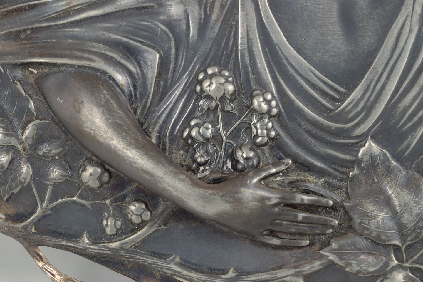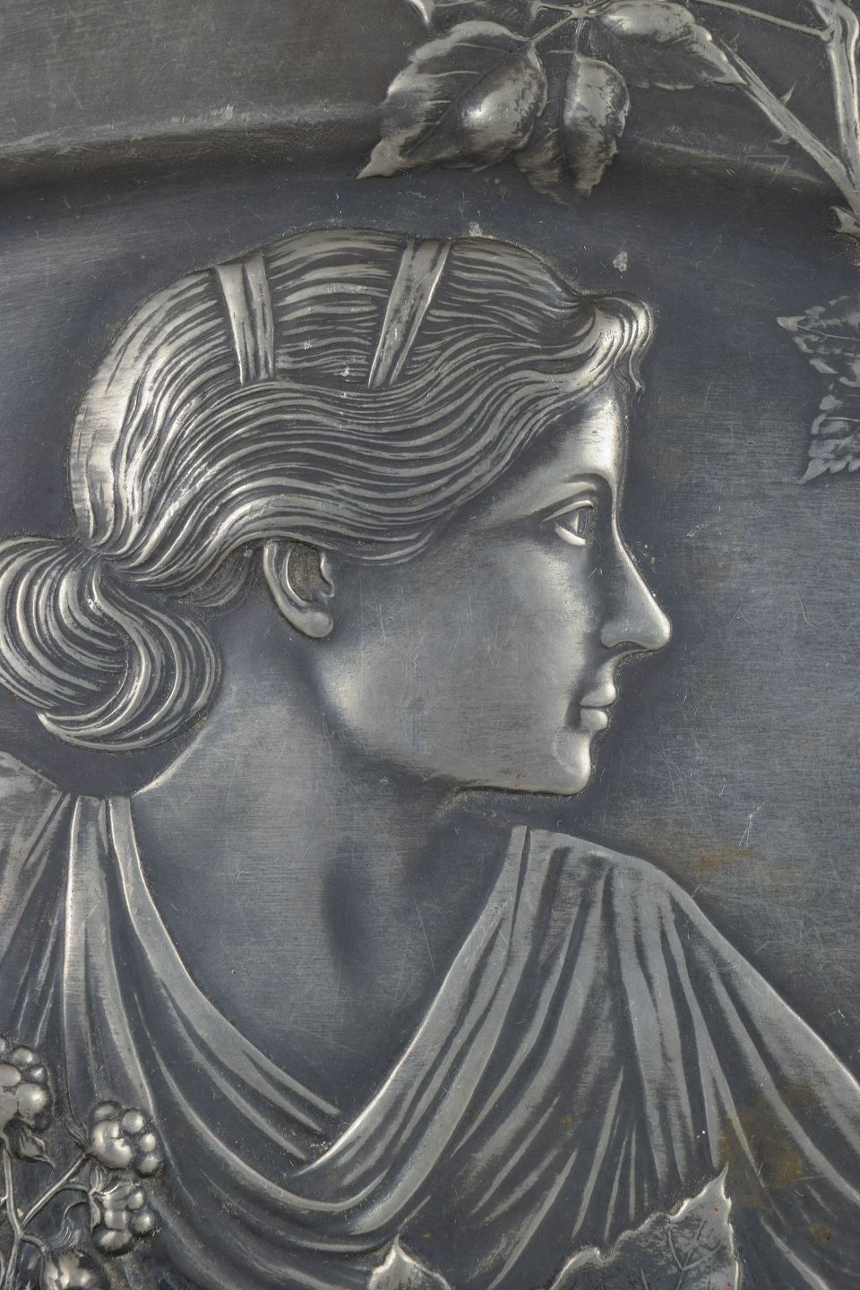 Large oval platter in silver-coloured metal with sculptural relief decoration in classic Jugendstil, depicting a female figure surrounded by flowing floral and foliate motifs. The composition is elegant and highly detailed, with soft, organic lines characteristic of WMF production from the period. Suitable both as a serving platter and for wall display. Signed, though the signature is indistinct.