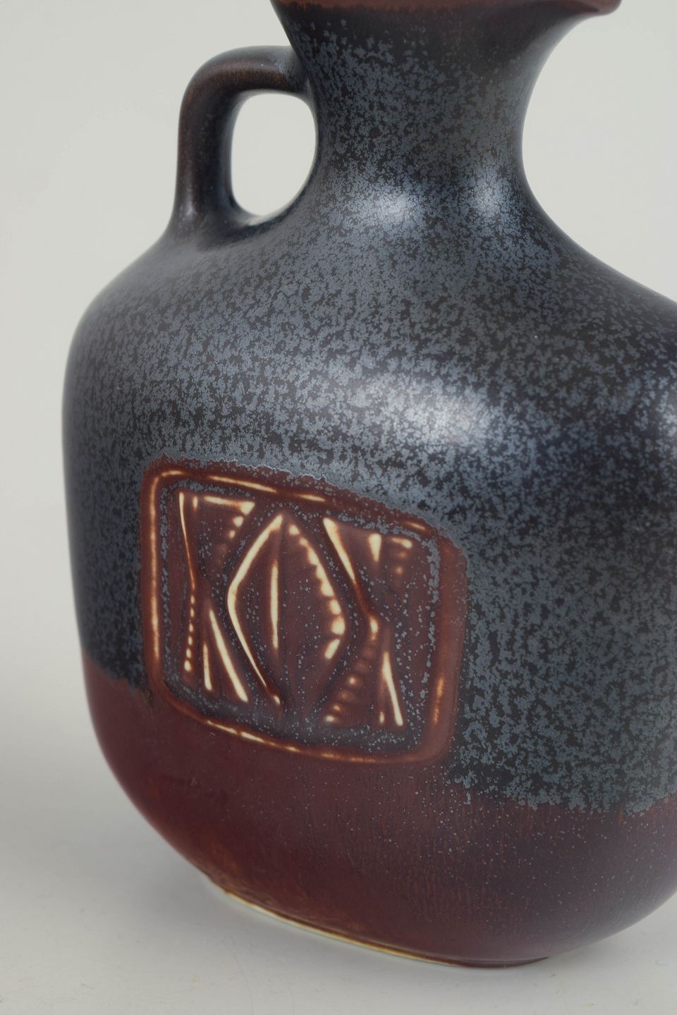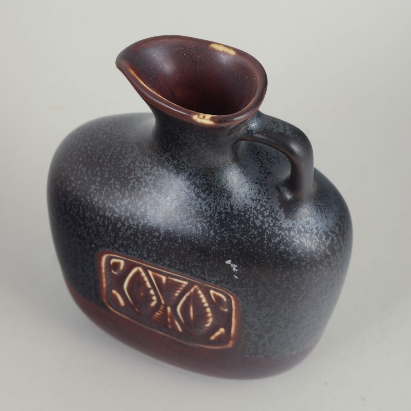 Compact and well-balanced stoneware pitcher with a rounded, sculptural body. Finished in a characteristic dark, finely speckled glaze in grey and deep brown tones, featuring an integrated handle and gently flared spout. A refined example of Gunnar Nylund’s work for Rörstrand in the mid-20th century, marked by confident proportions and material sensitivity.