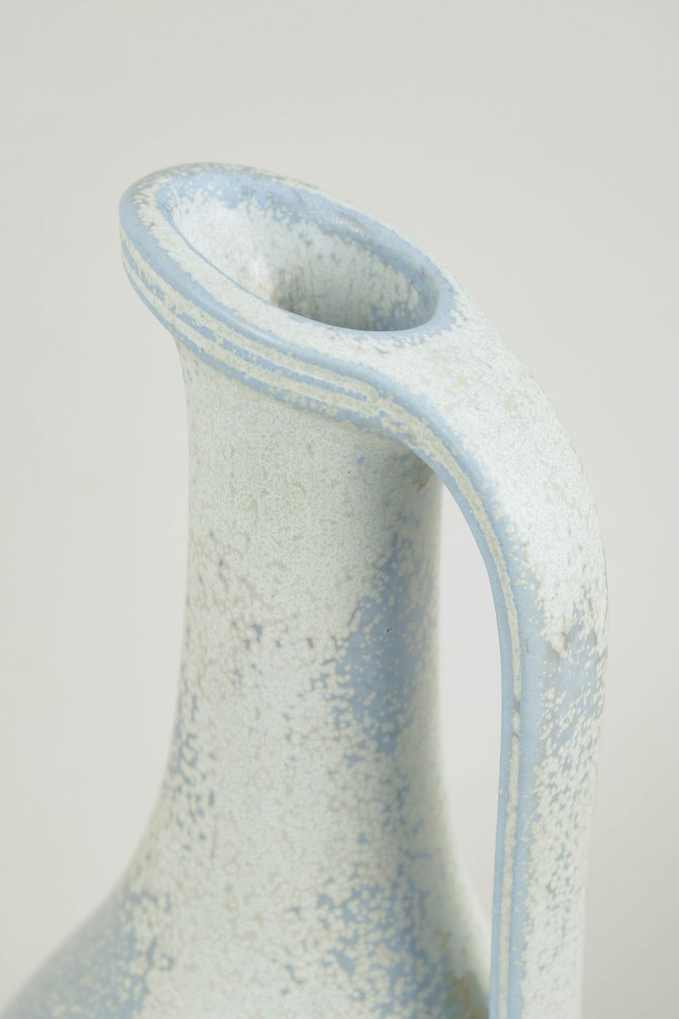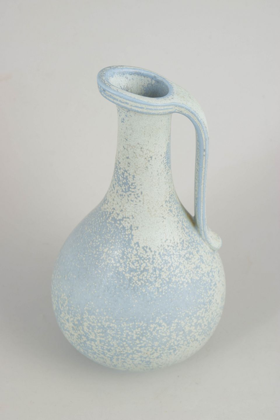 Elegant and well-balanced stoneware pitcher with a soft, organic silhouette. Finished with a characteristic light, speckled glaze in cool bluish and cream tones, typical of Gunnar Nylund’s production at Rörstrand in the mid-20th century. Harmoniously proportioned with an integrated handle and gently flared spout.