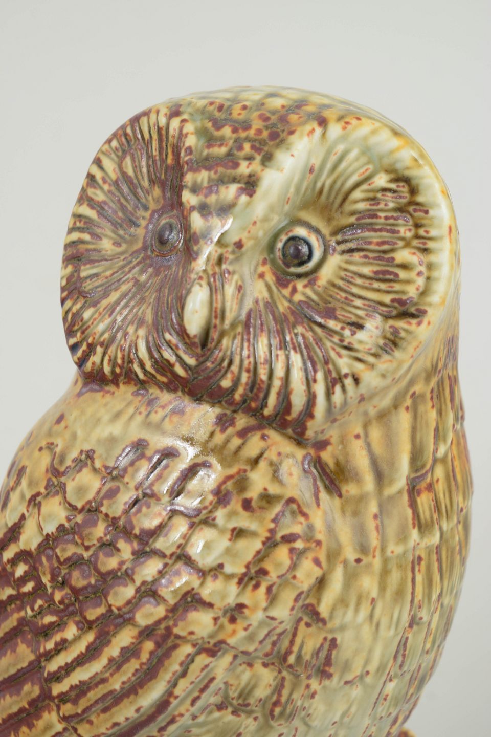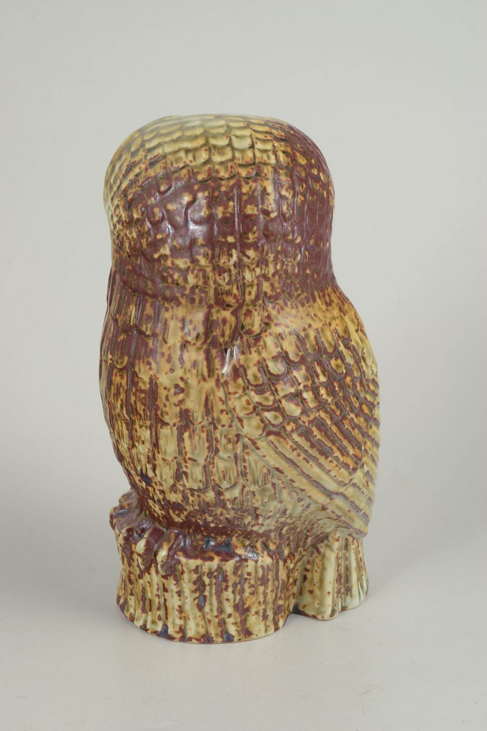 Naturalistic owl figure in stoneware with detailed relief and a vibrant, multicoloured glaze in earthy tones. A distinctive sculptural piece with a clear reference to nature, executed in a robust and decorative expression.