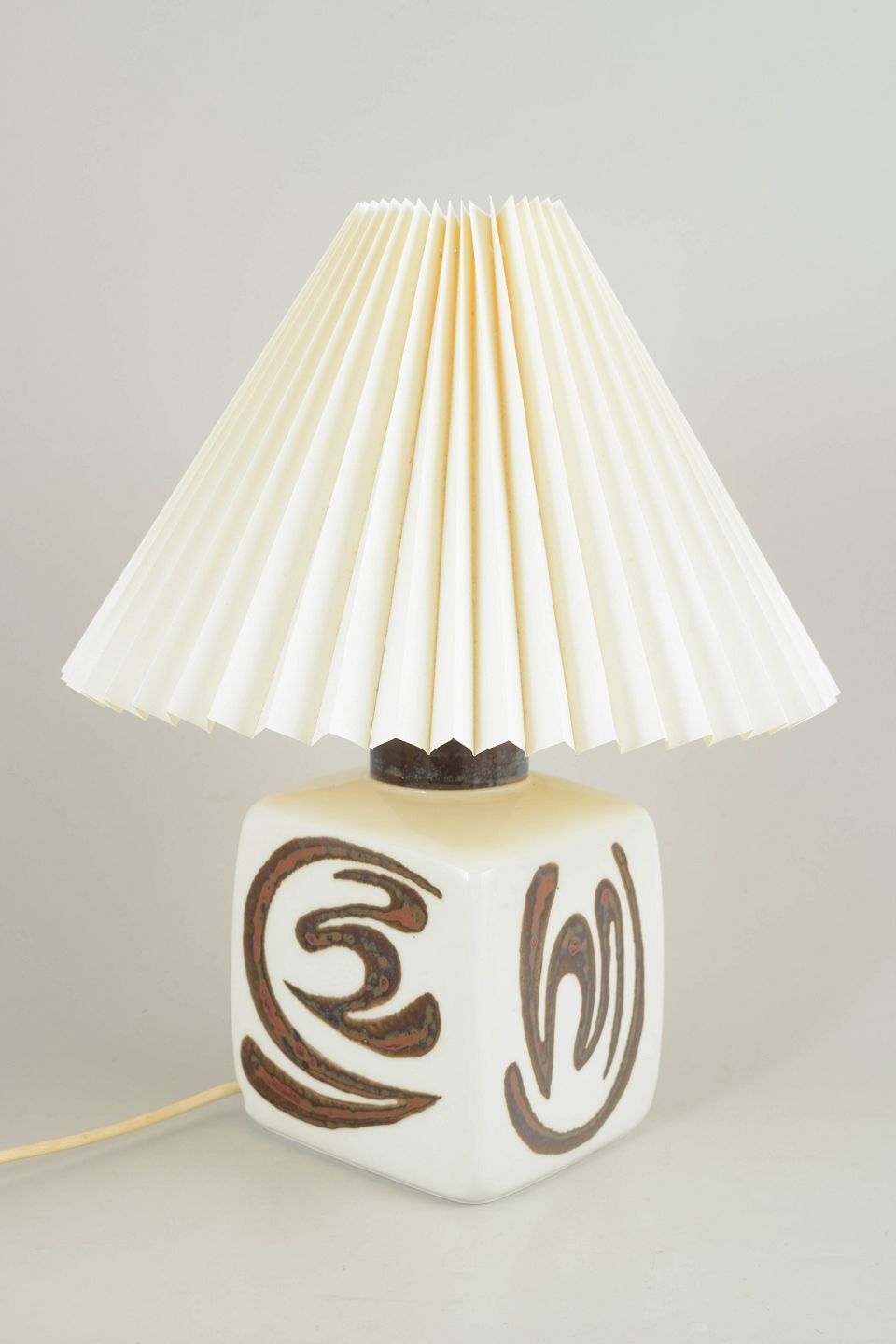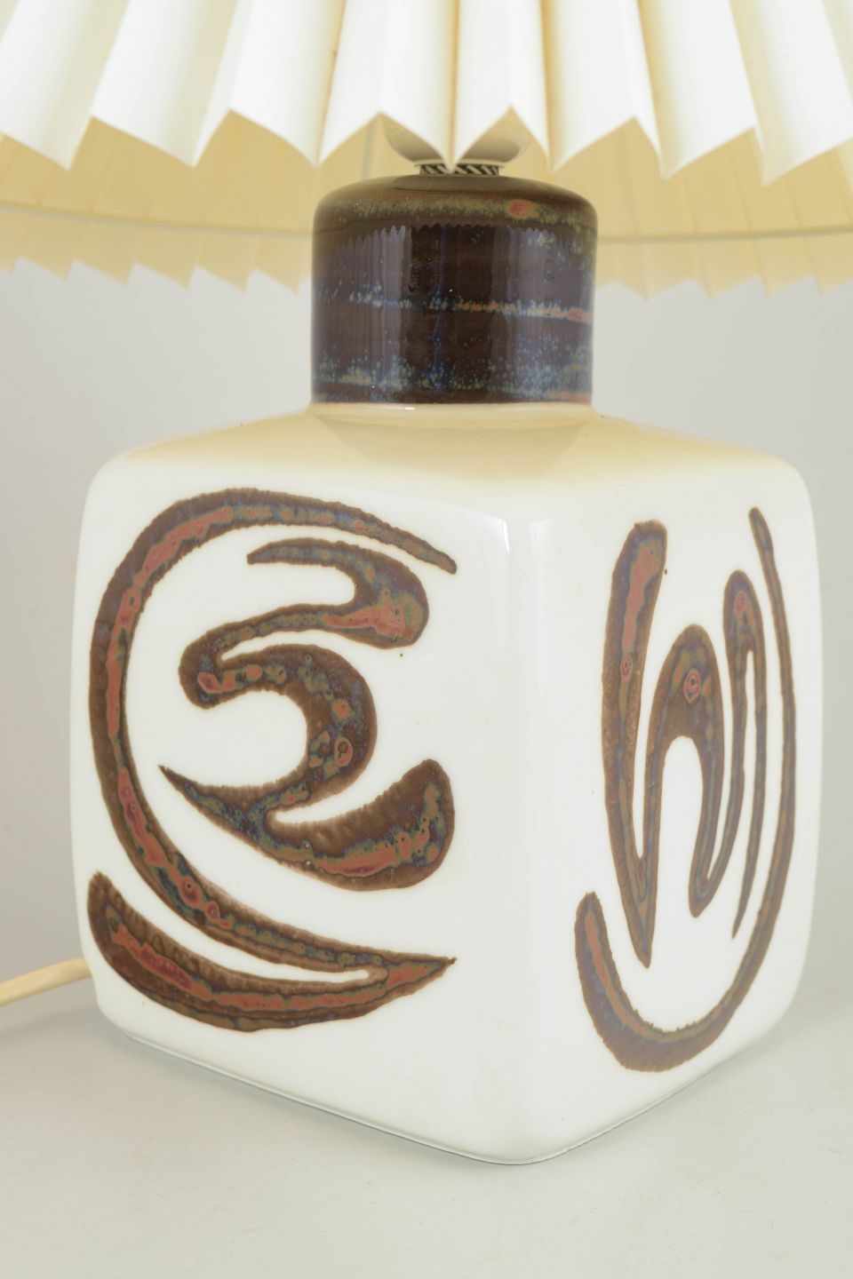Ceramic table lamp in stoneware with hand-decorated relief in brown and black tones on a white ground. Square lamp base with graphic, Oriental-inspired ornamentation. Original Danish design Le Klint pleated shade. A strong example of Swedish modernism from the 1960s.
