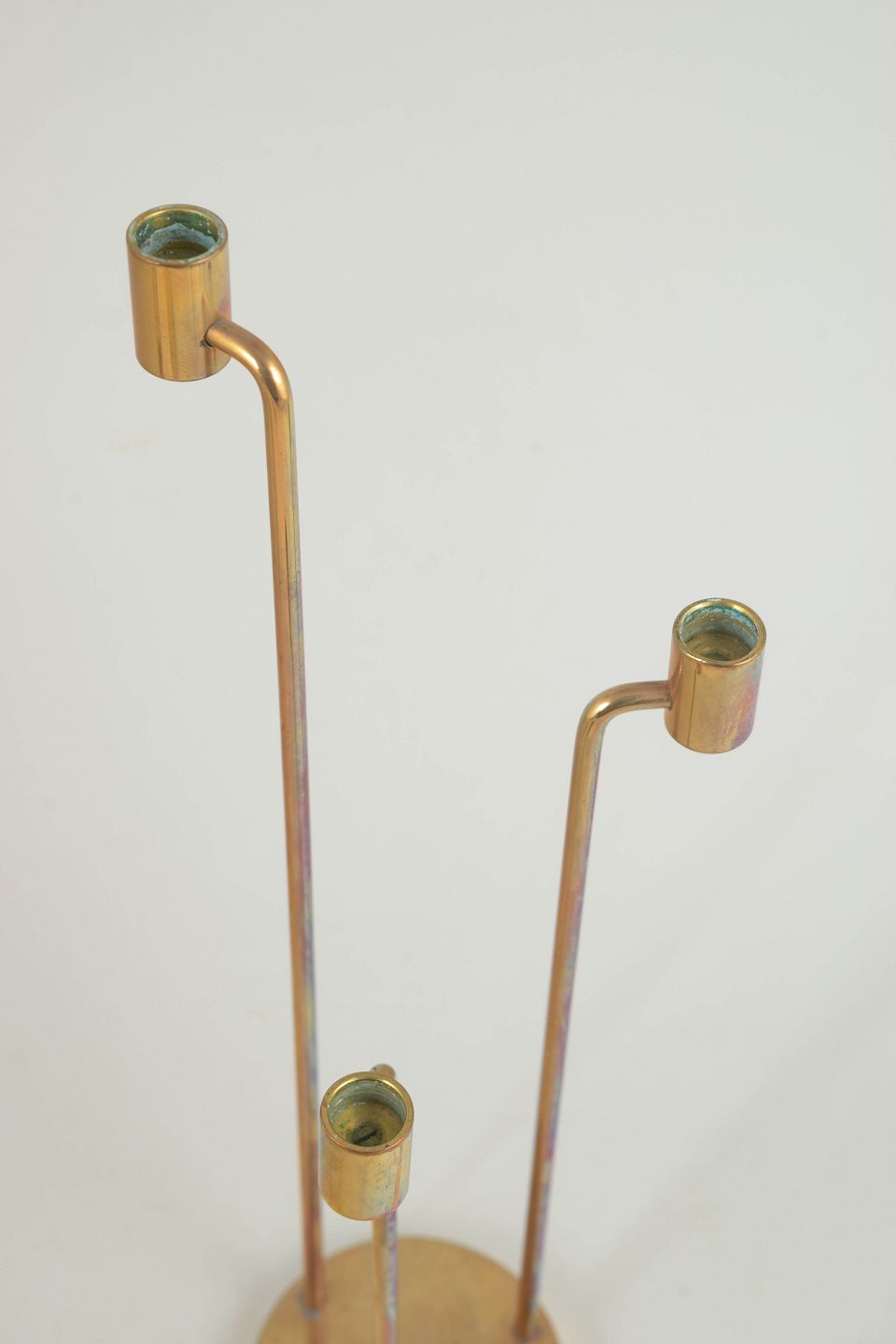Sculptural three-armed candlestick in solid brass with slender vertical arms of varying heights. A restrained and elegant modernist design, firmly rooted in Scandinavian aesthetics of the 1960s.