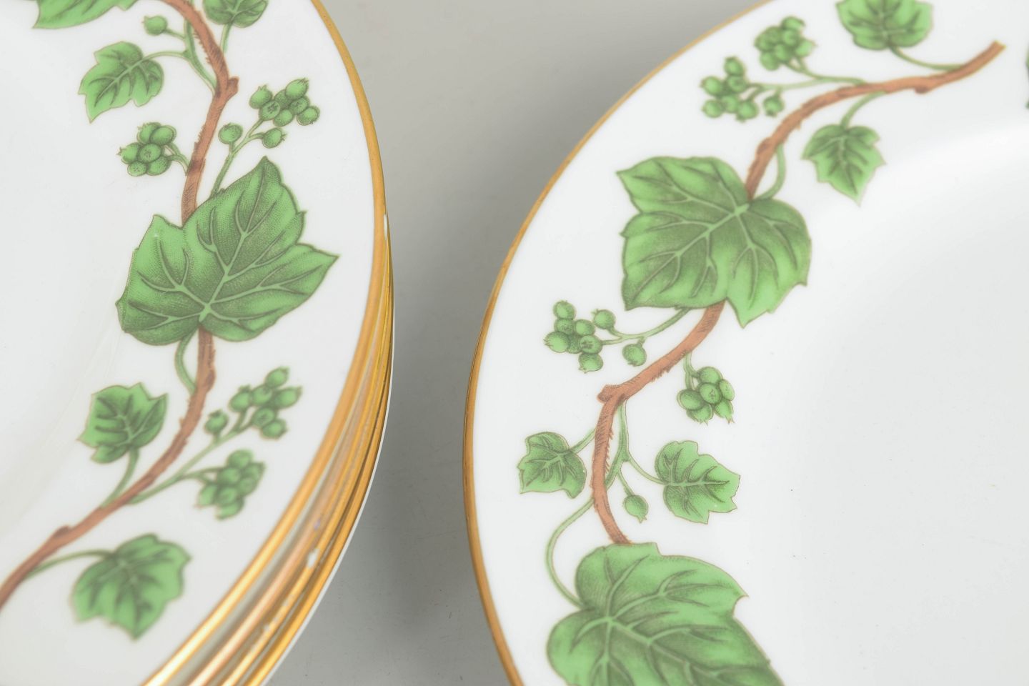 Decorative faience plates with green ivy decoration and gilt rim, produced in Staffordshire, England.