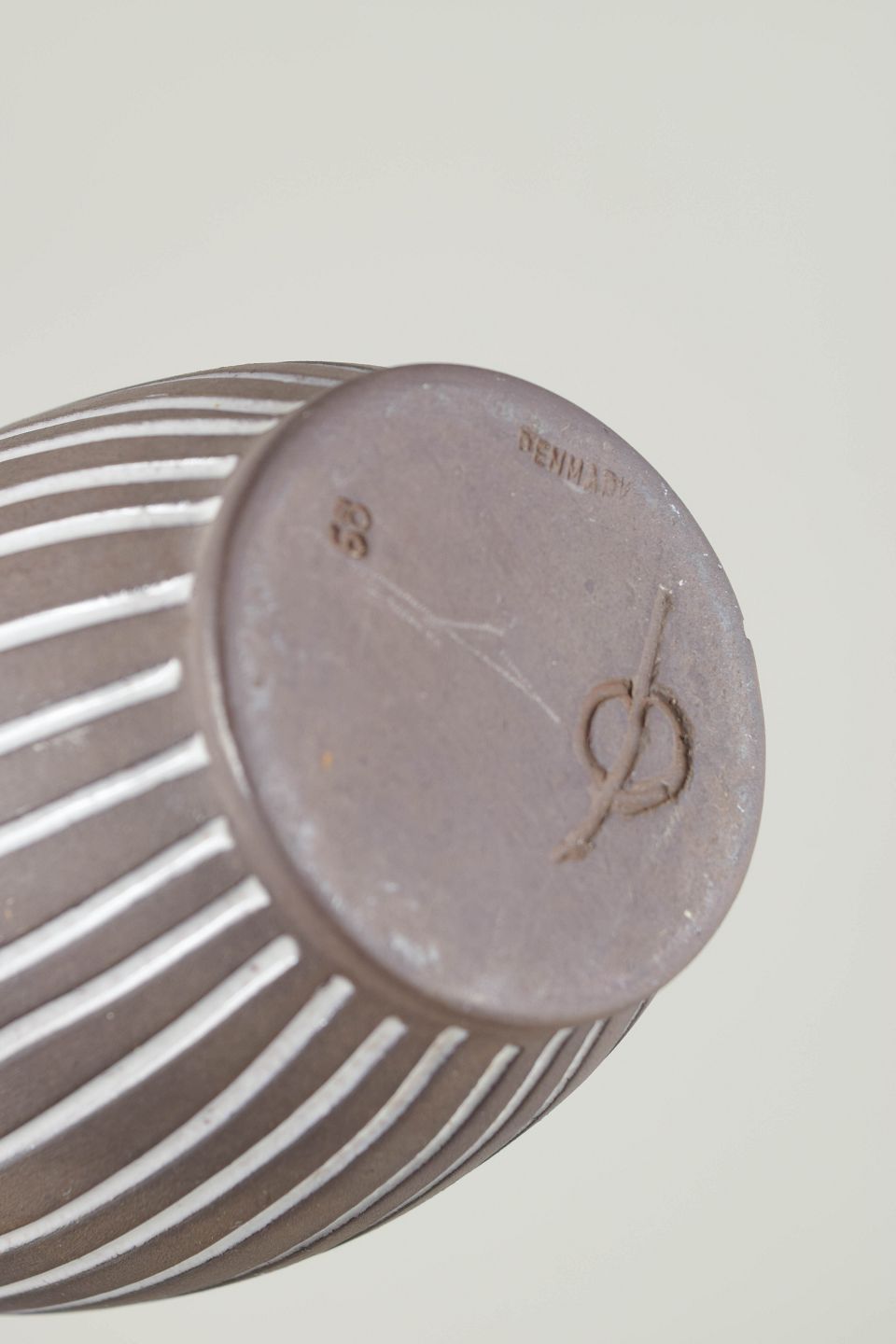 Slender, elongated stoneware vase with characteristic hand-painted white striped décor on a dark brown body. An elegant example of Nordic modernist design.