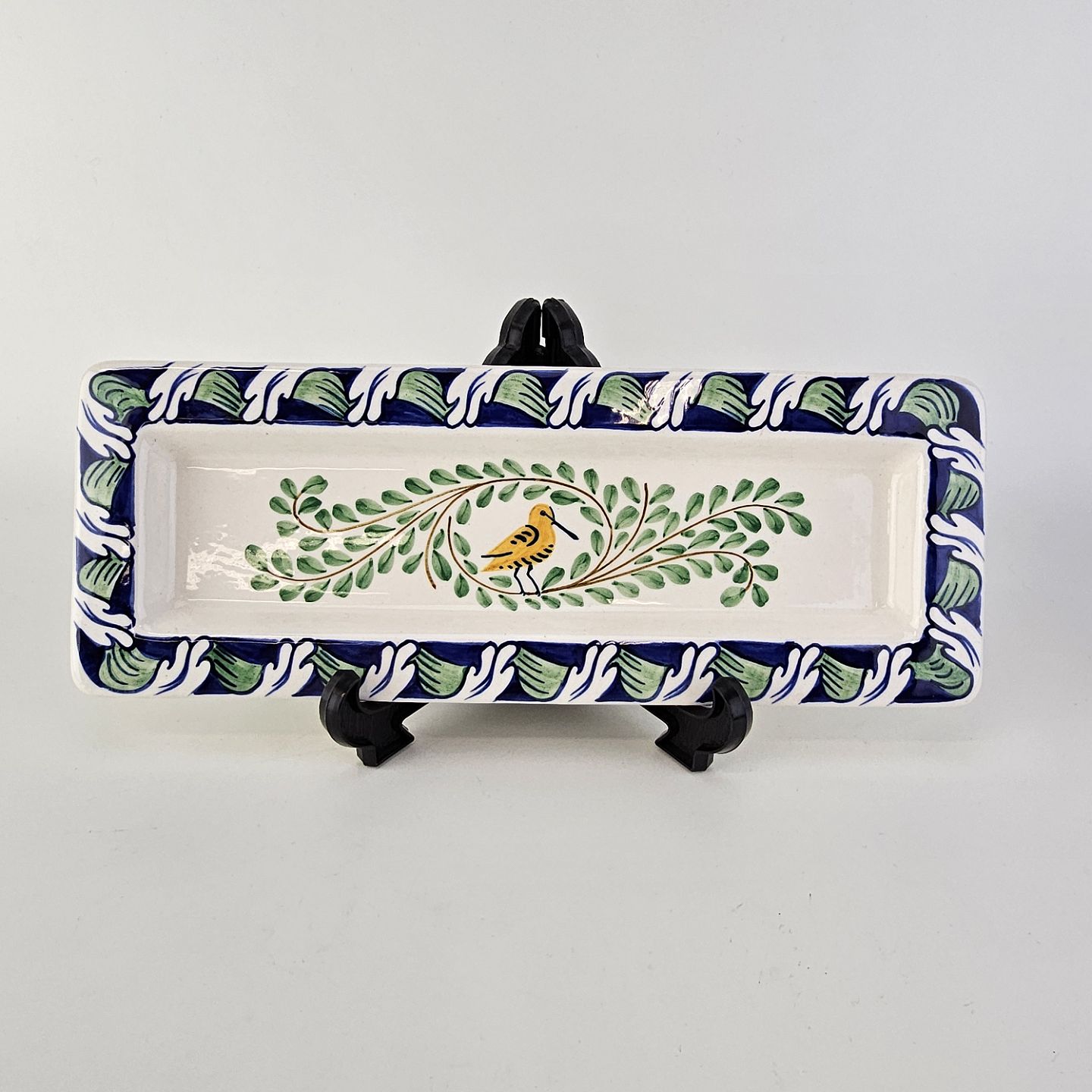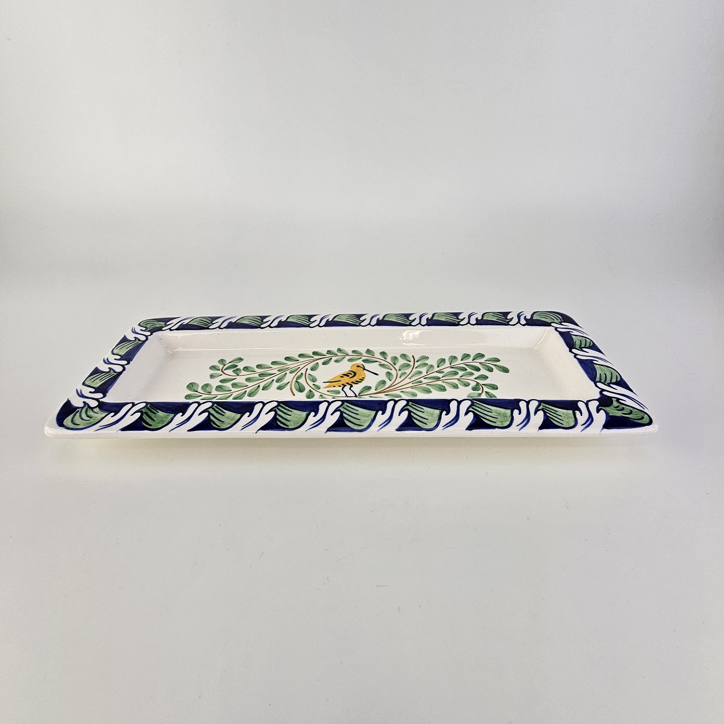 Pennebakke i fajance med dekoration af en gul fugl, blade og blå kant med blomster, flot stand.