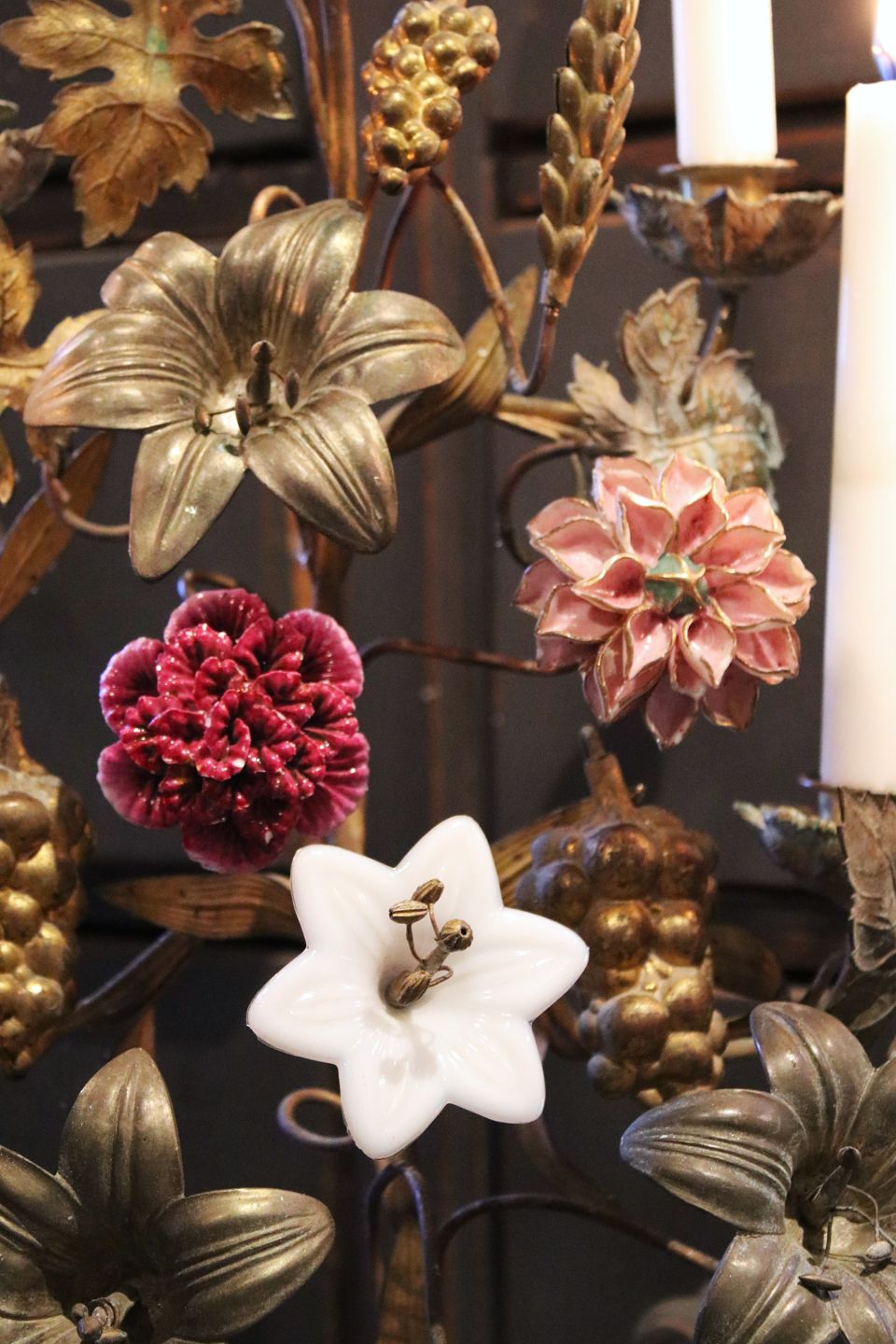 The candlestick has space for 7 candles and is decorated with 2 fine colored porcelain flowers, 1 white opal glass flower, bunches of grapes, ears of corn, vine leaves and large lily flowers in bronze.