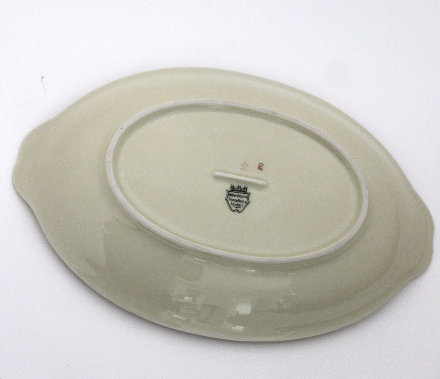 Text available in Danish: Kjøbenhavns Porcellains Maleri, Rosenborg, Brødbakke sjælden. Længde 29,5 cm. Bredde 19 cm. Højde 5 cm. Lettere brugsslid på guldkant. Pris: 350 kr. stk. Lager: 1