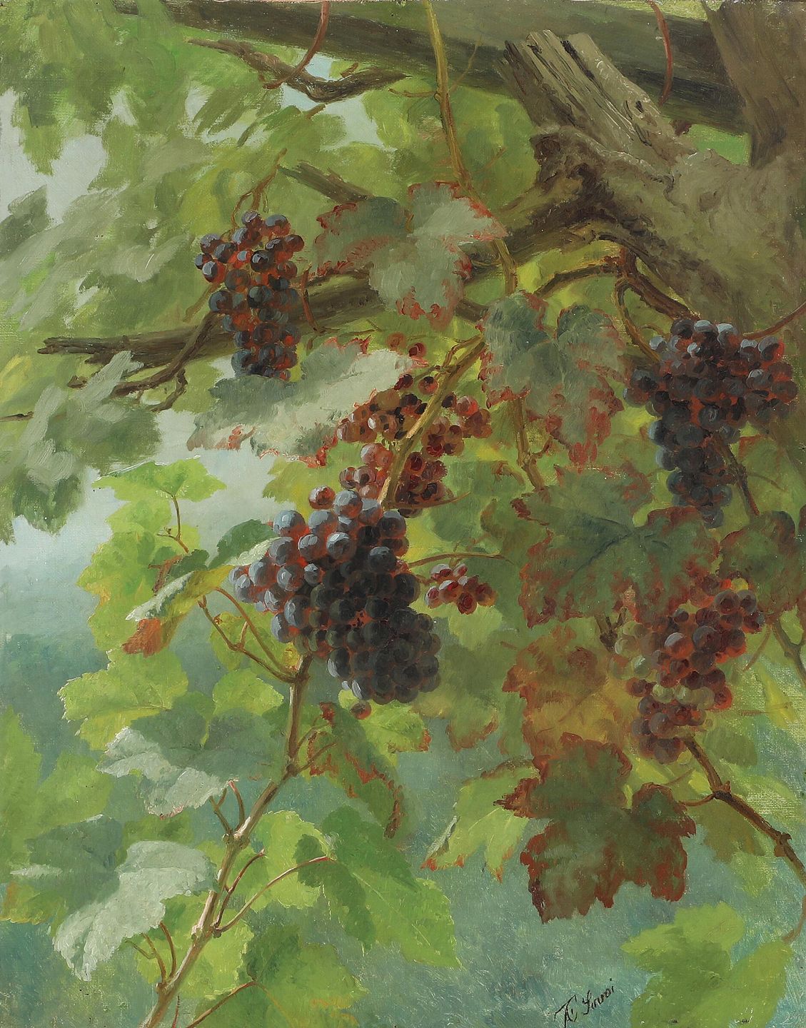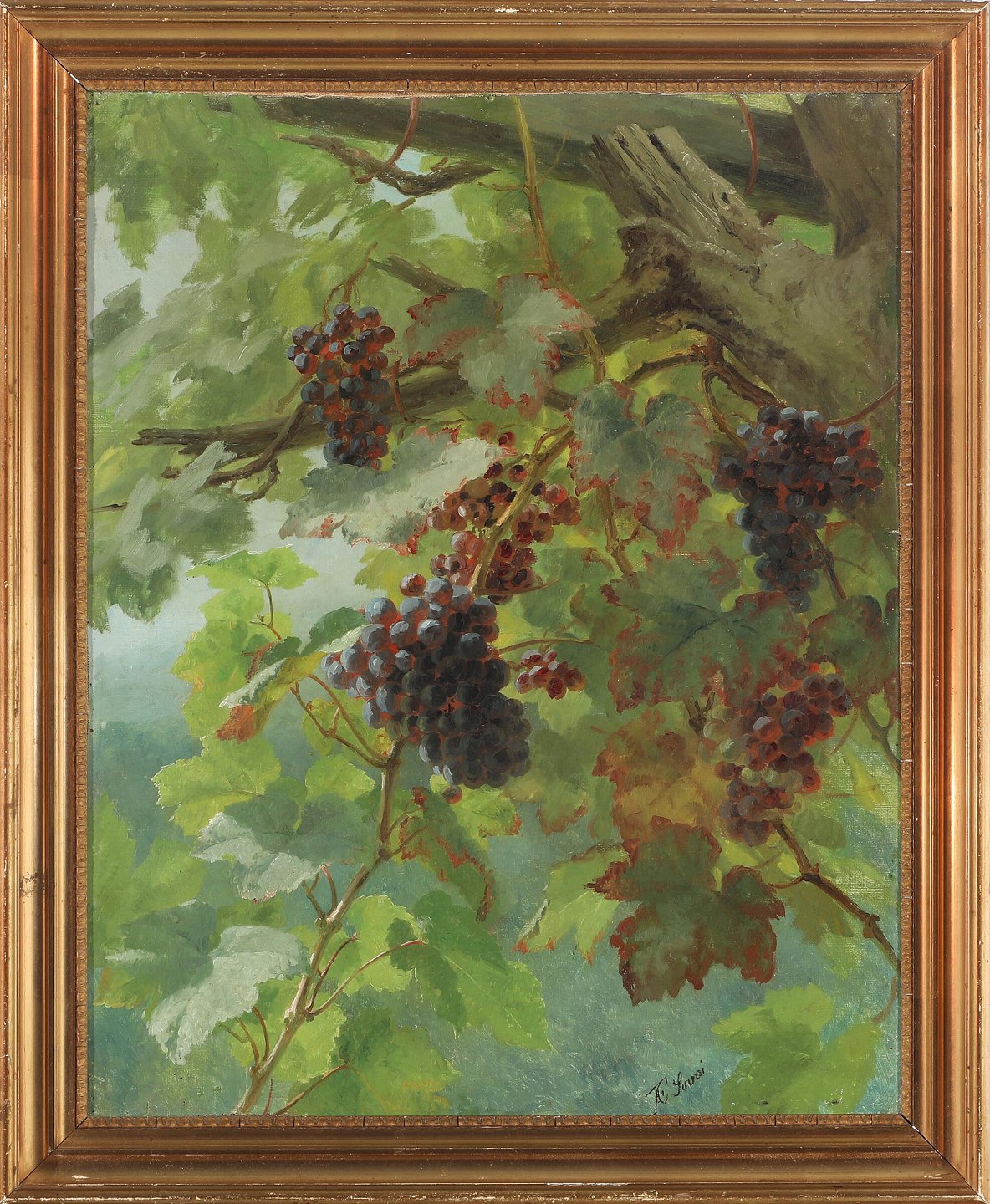 "Blue Grapes" painting in a gilded frame, the painting is with reinforced canvas.