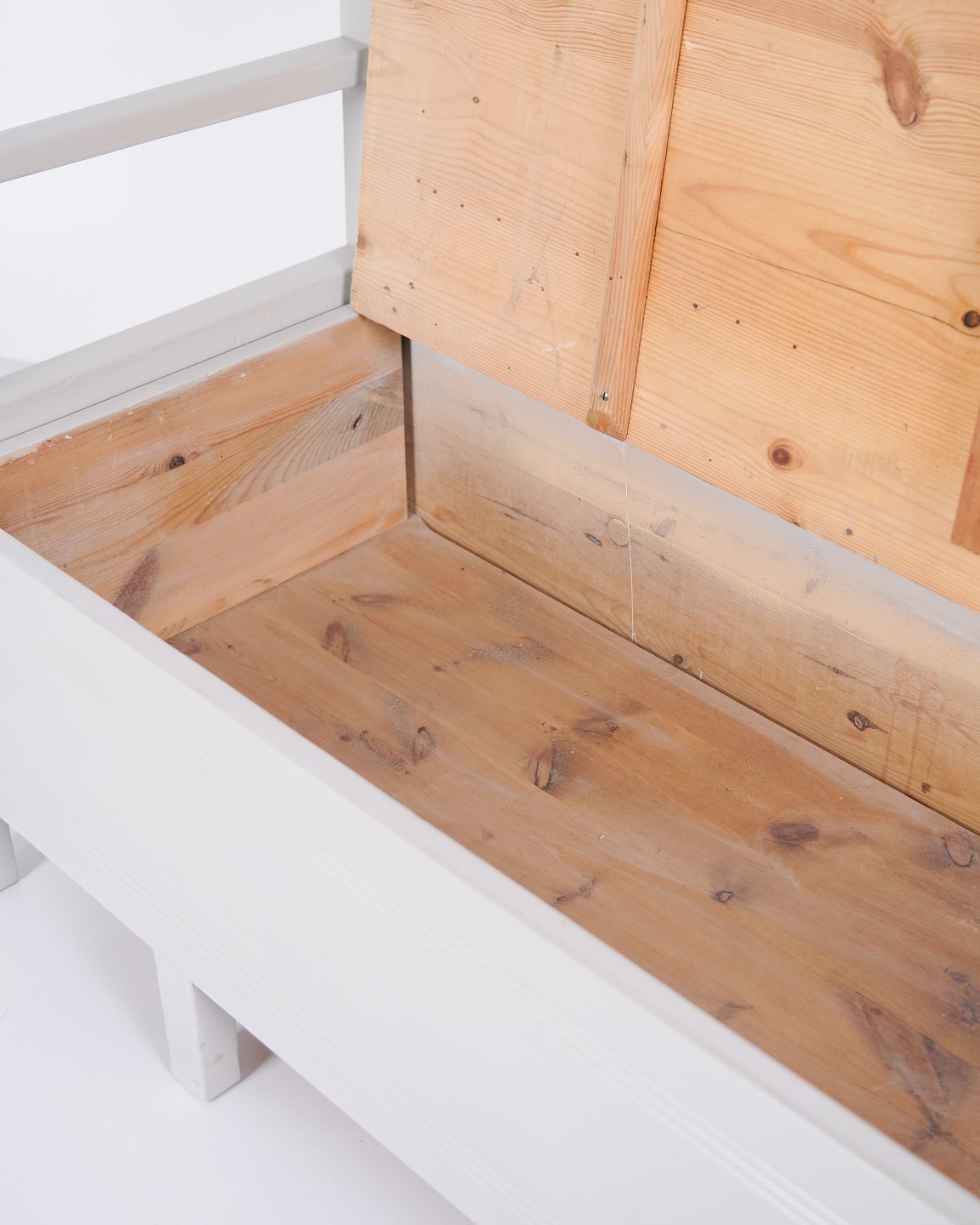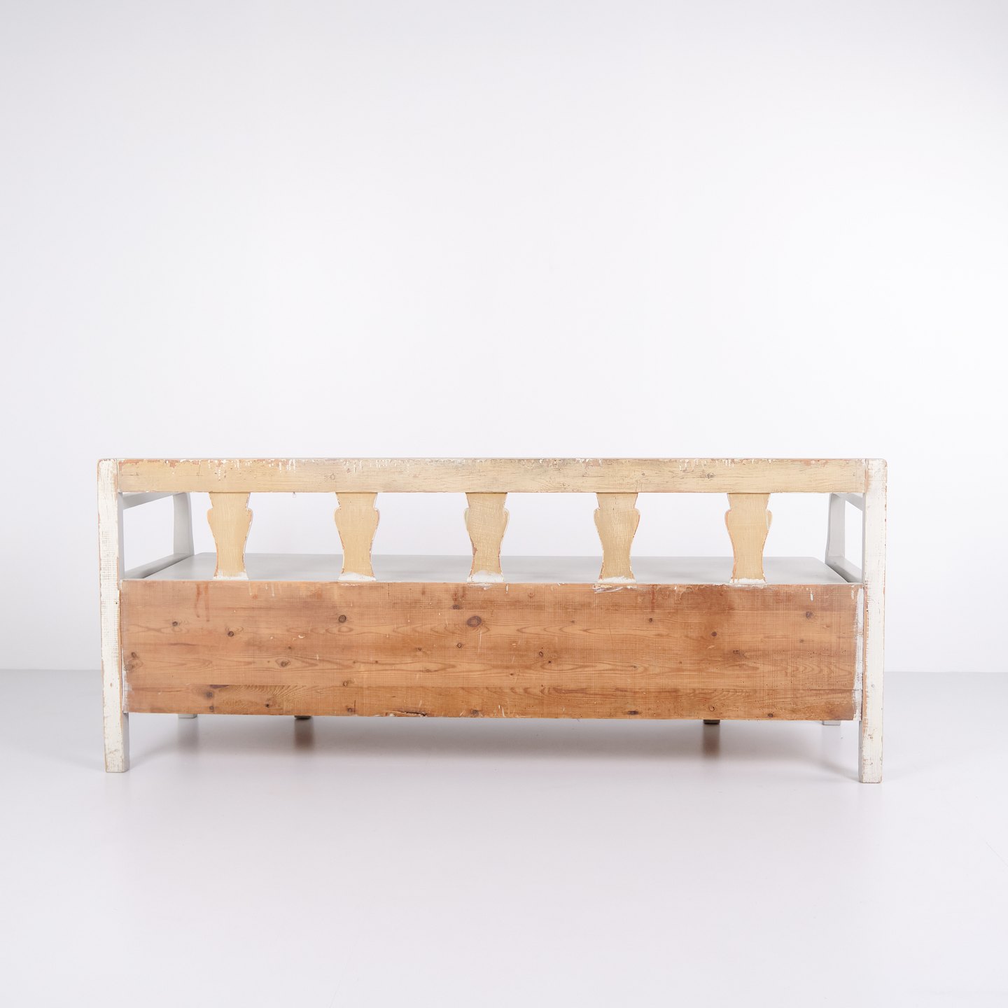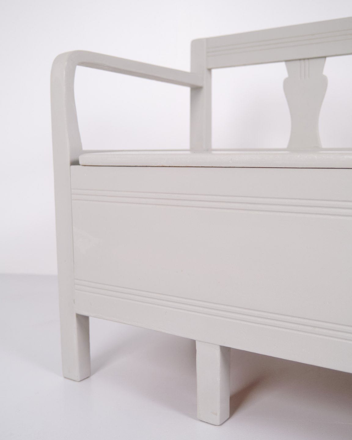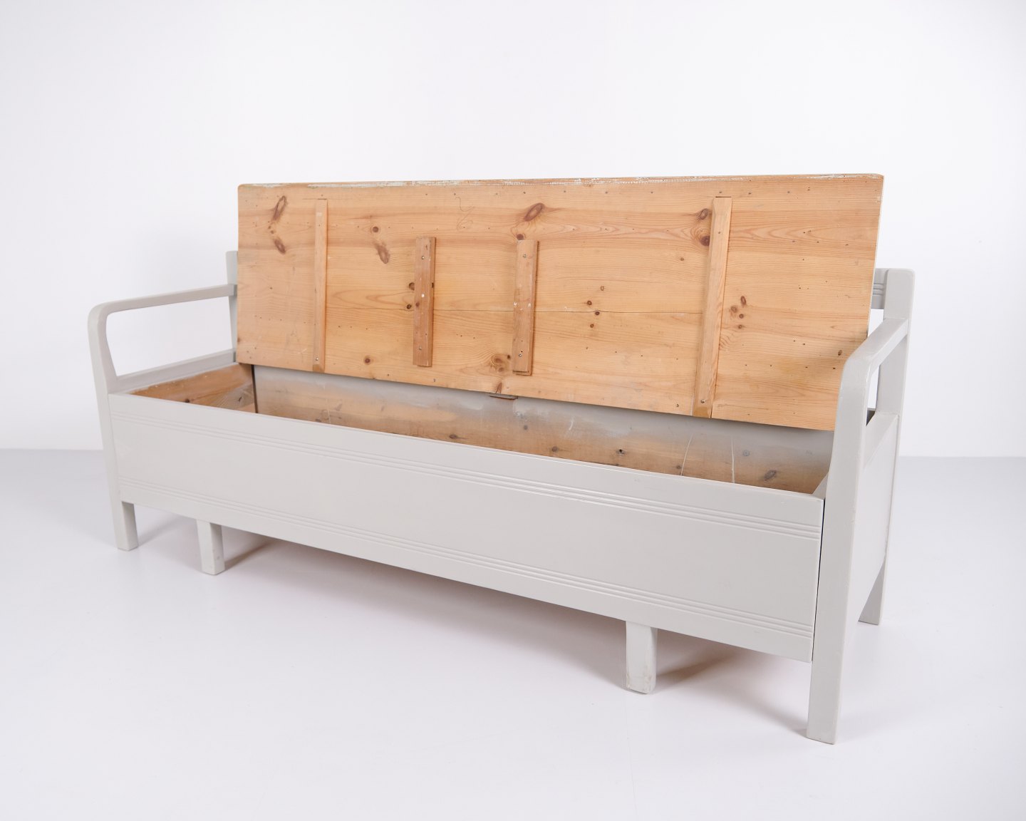 Antique beater bench from the 1860s in gray painted pine. Classic folk design with seating and storage. Historical and functional furniture.