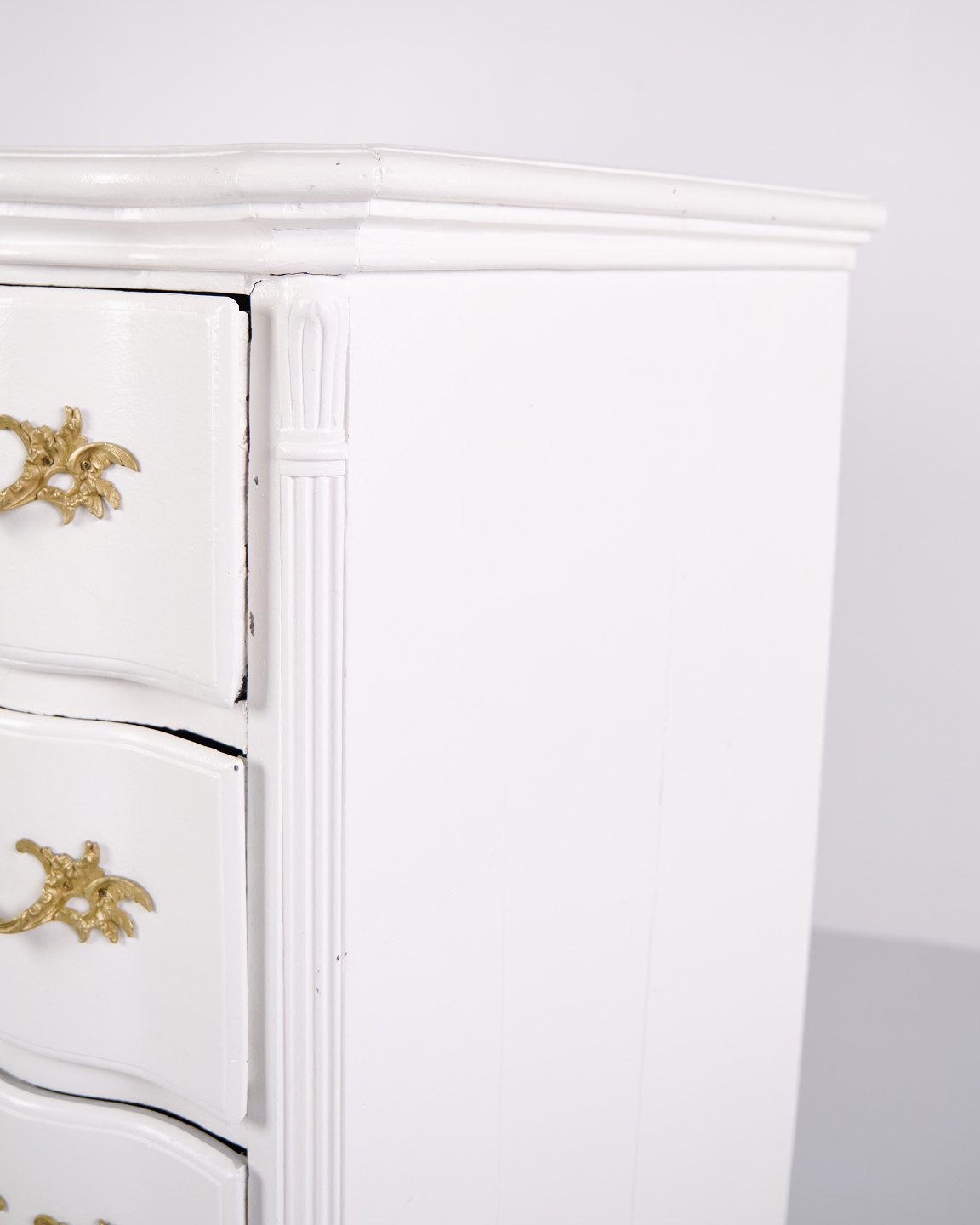 Antique baroque chest of drawers from the 1760s, painted white with brass handles. Four drawers and a distinctive baroque design. Historical and decorative piece of furniture.