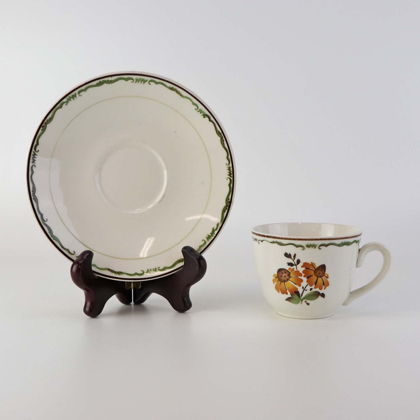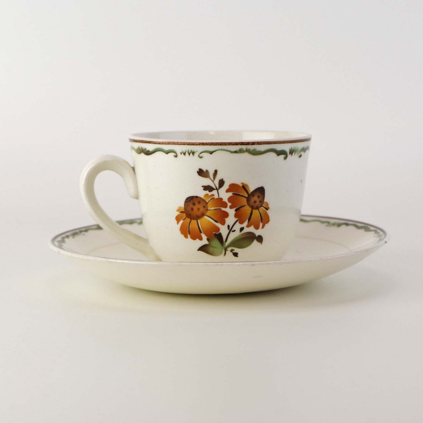 Text available in Danish: Kaffekop med underkop i fajance fra stellet Solbrud fremstillet i perioden 1937-1967. Nr. 2049